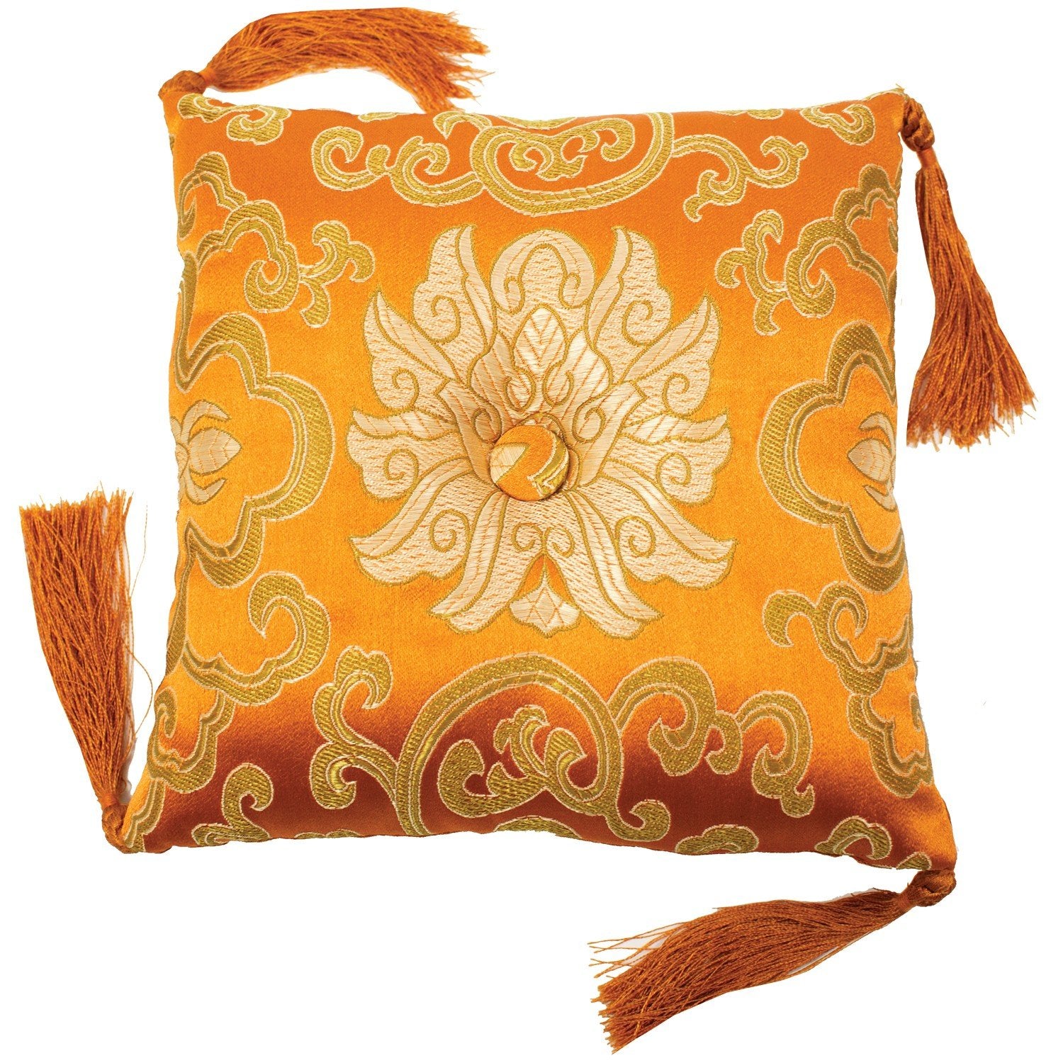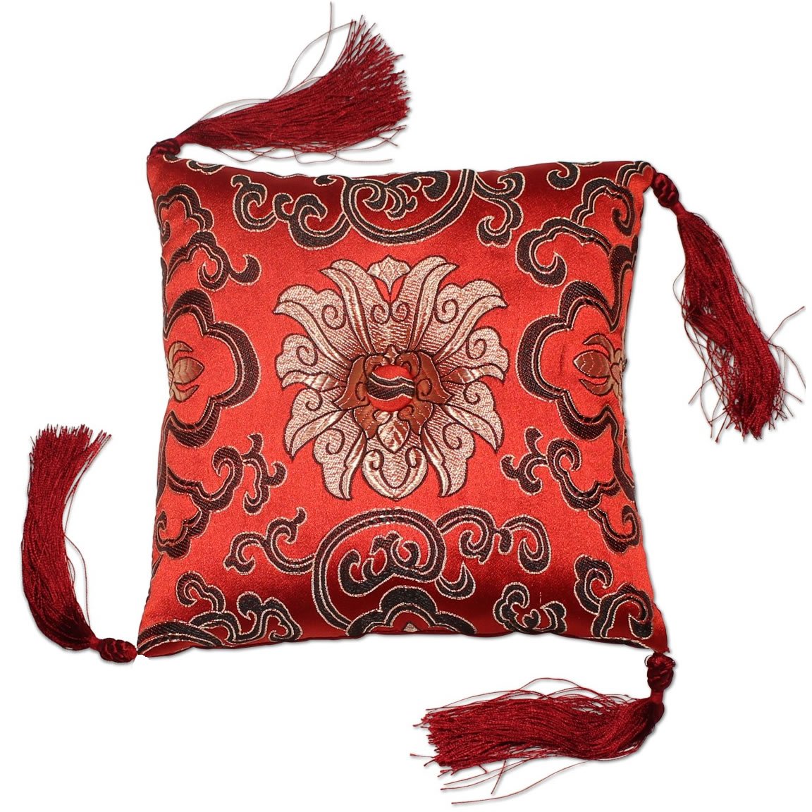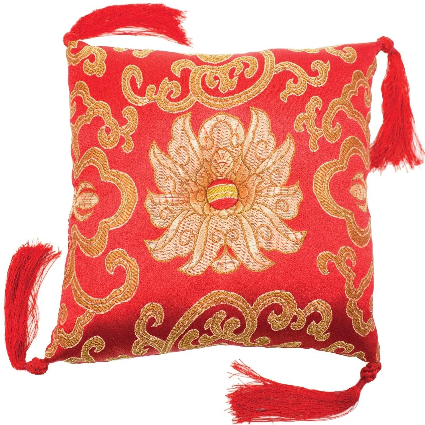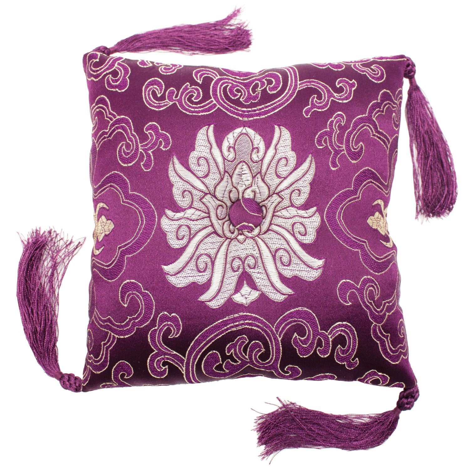 Complement your singing bowl and meditation practice with this elegant brocade bowl cushion. The pillow can also be used for the display of statues, jewelry and other objects of beauty. Durable brocade is a mix of silk and synthetic fibers. Center button is surrounded a lotus flower design. Measures 7 inches square - plus or minus 0.5 inches and approx. 1.5 inches thick. Corner tassels have braided embellishment. Choice of colors. Made in Nepal.