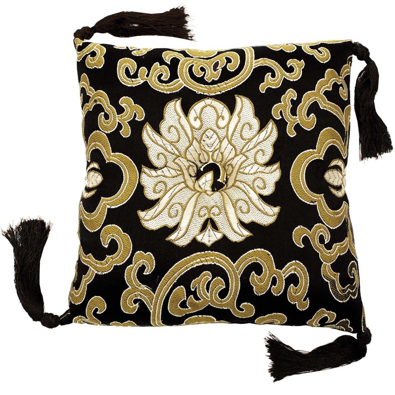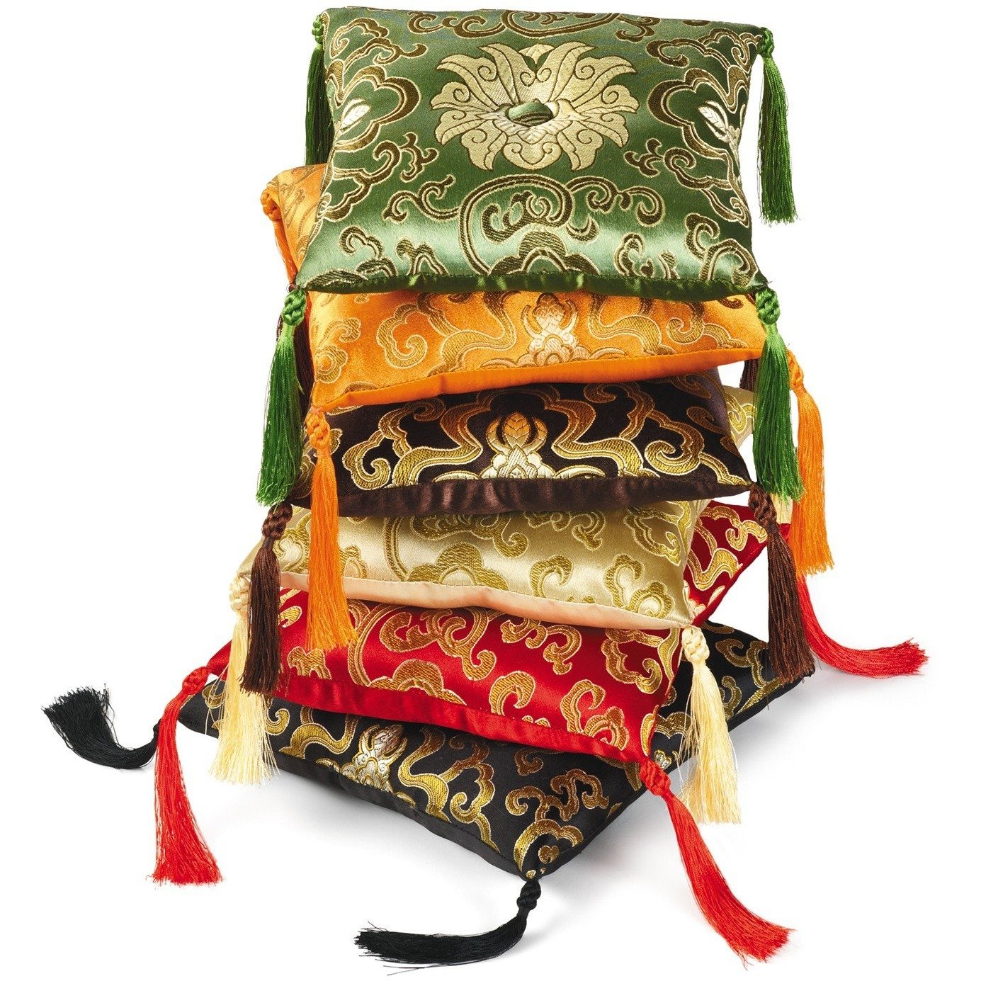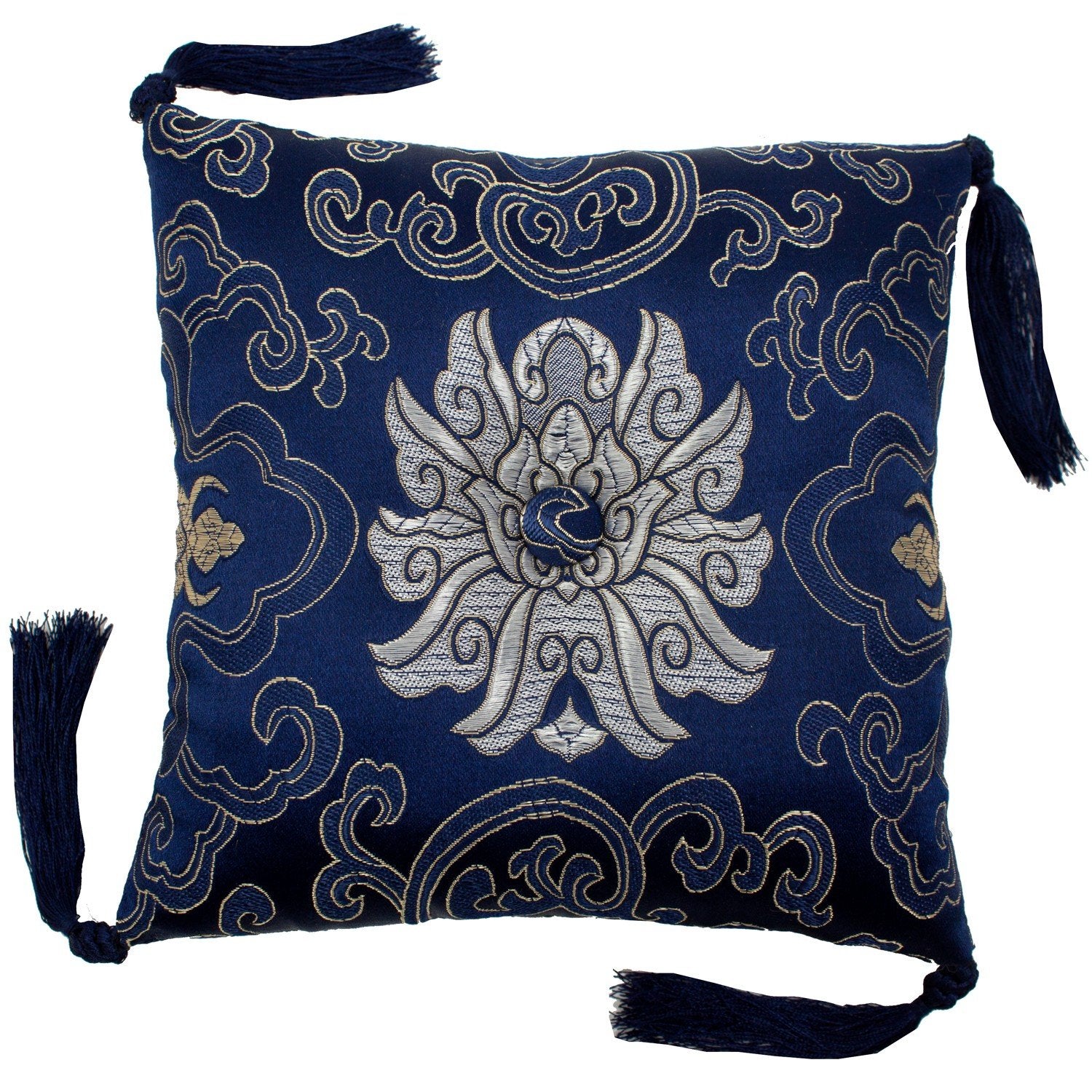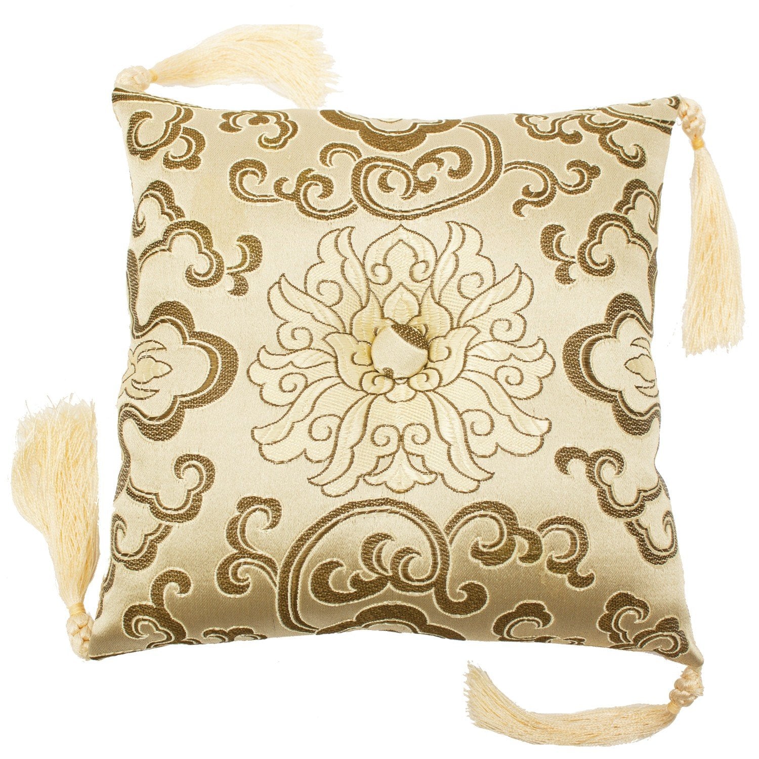 Complement your singing bowl and meditation practice with this elegant brocade bowl cushion. The pillow can also be used for the display of statues, jewelry and other objects of beauty. Durable brocade is a mix of silk and synthetic fibers. Center button is surrounded a lotus flower design. Measures 7 inches square - plus or minus 0.5 inches and approx. 1.5 inches thick. Corner tassels have braided embellishment. Choice of colors. Made in Nepal.