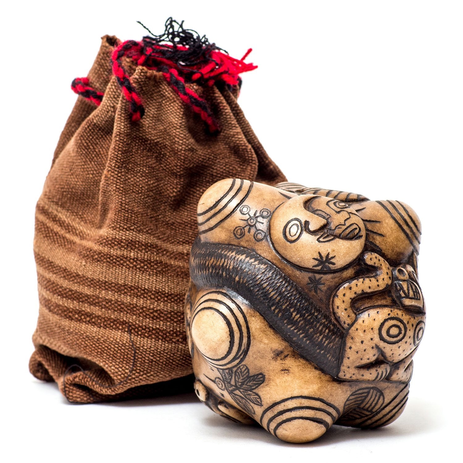 Masterfully hand carved alabaster-like Apu de 7 Puntas Stone, or Mountain of Seven Points Stone, embodies the energy of the Apus, mountain spirits, and displays the Andean cosmology symbols. Carved by Cusco artists, Abelardo and Luz Marina. This stone features the carvings of amaru, the sacred serpent Sachamama; Otorongo, the jaguar, and Kuntor, or Apuchin-Condor, among others. Because these are hand-carved, slight variations from photo can occur. Accompanied by its own hand woven drawstring pouch ion various colors. Makes a great arte for your mesa or other sacred space. Handcrafted in Peru.