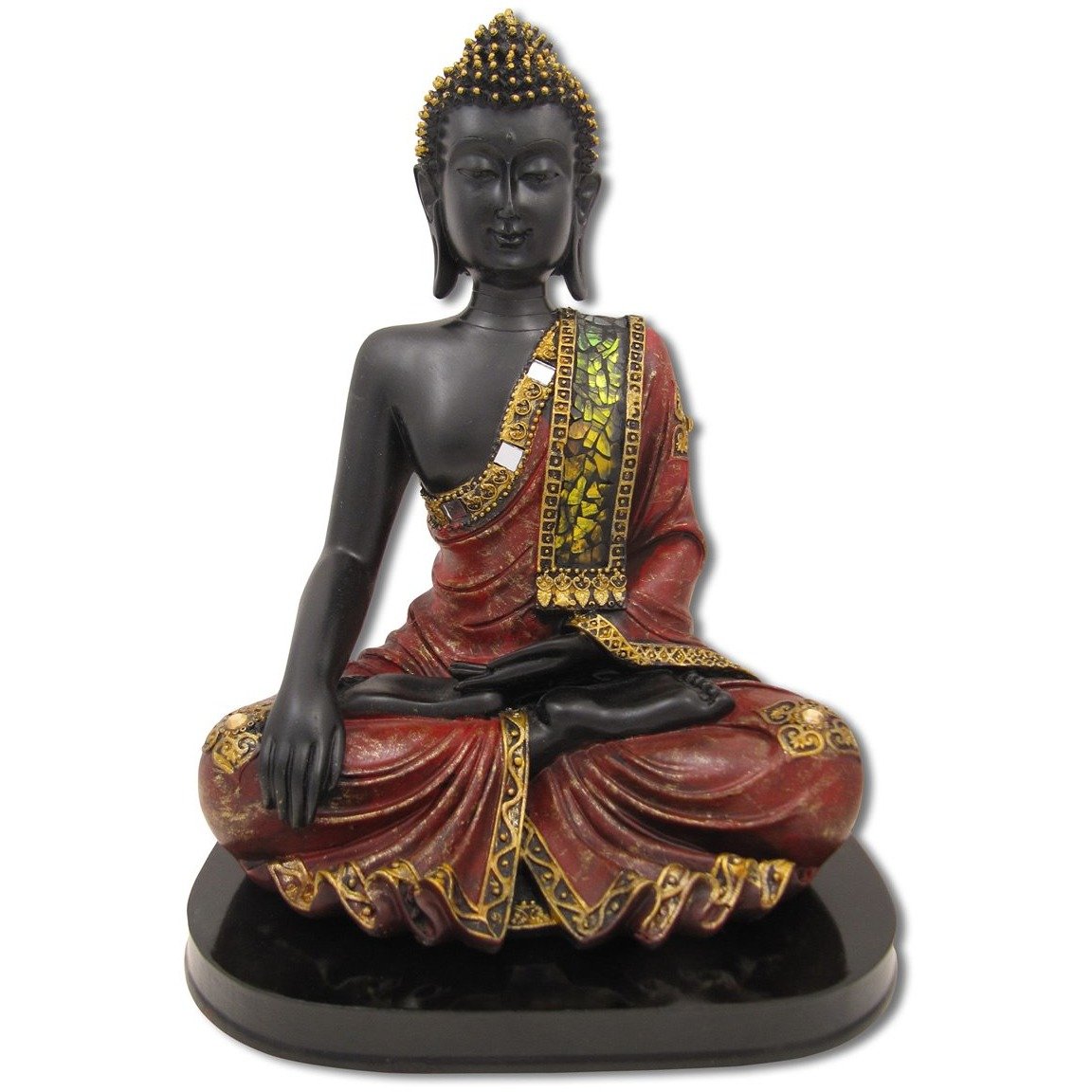 Spiritually brighten up your space with this strikingly beautiful Buddha statue. This 10" x 7.5", resin statue is a hand crafted work of art. The Buddha is draped in an antique red robe falling gracefully about his crossed legs. Mosaic pink and green glasswork and tiny mirrors on the robe contrast superbly with the black finish of the statue. Buddha's left hand facing upward, lies in his lap in Dhyana (meditation) Mudra. His right hand hangs over his knee, fingertips pointing to the ground in Bhumisparsha Mudra. This mudra symbolizes enlightenment, as well as steadfastness as it is associated with subduing the daemon Mara. Hand-finished, minor variations and imperfections add to the artistic character of each piece.