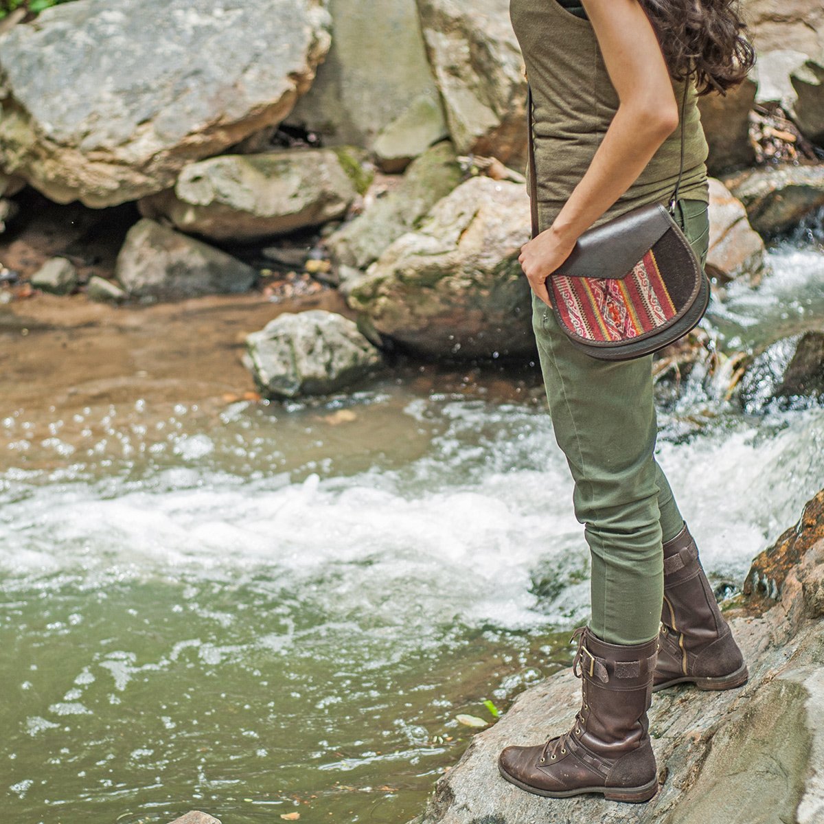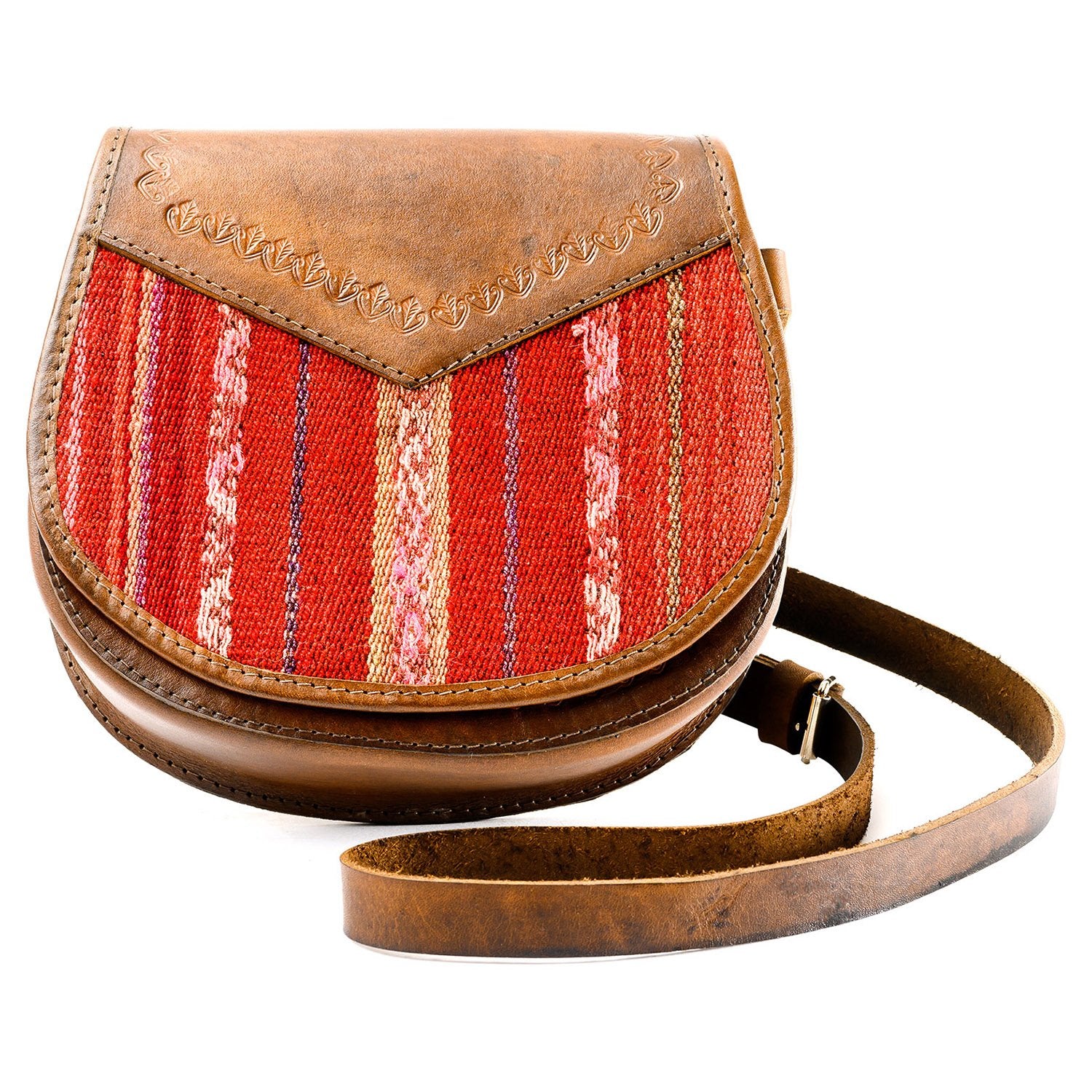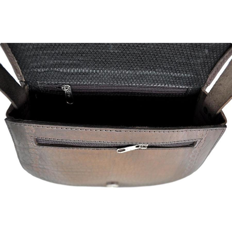 This petite but sturdy boxy-constructed shoulder strap bag is made of genuine cow’s leather with unique handwoven sheep wool aguayo cloth inset. Aguayo is a typical fabric of the Andes characterized by its durability and colorfulness. The bag has two small zip pockets, an adjustable strap and a magnetic clasp closure. Leather is embossed with decorative designs. Your choice of styles. Made in Bolivia.