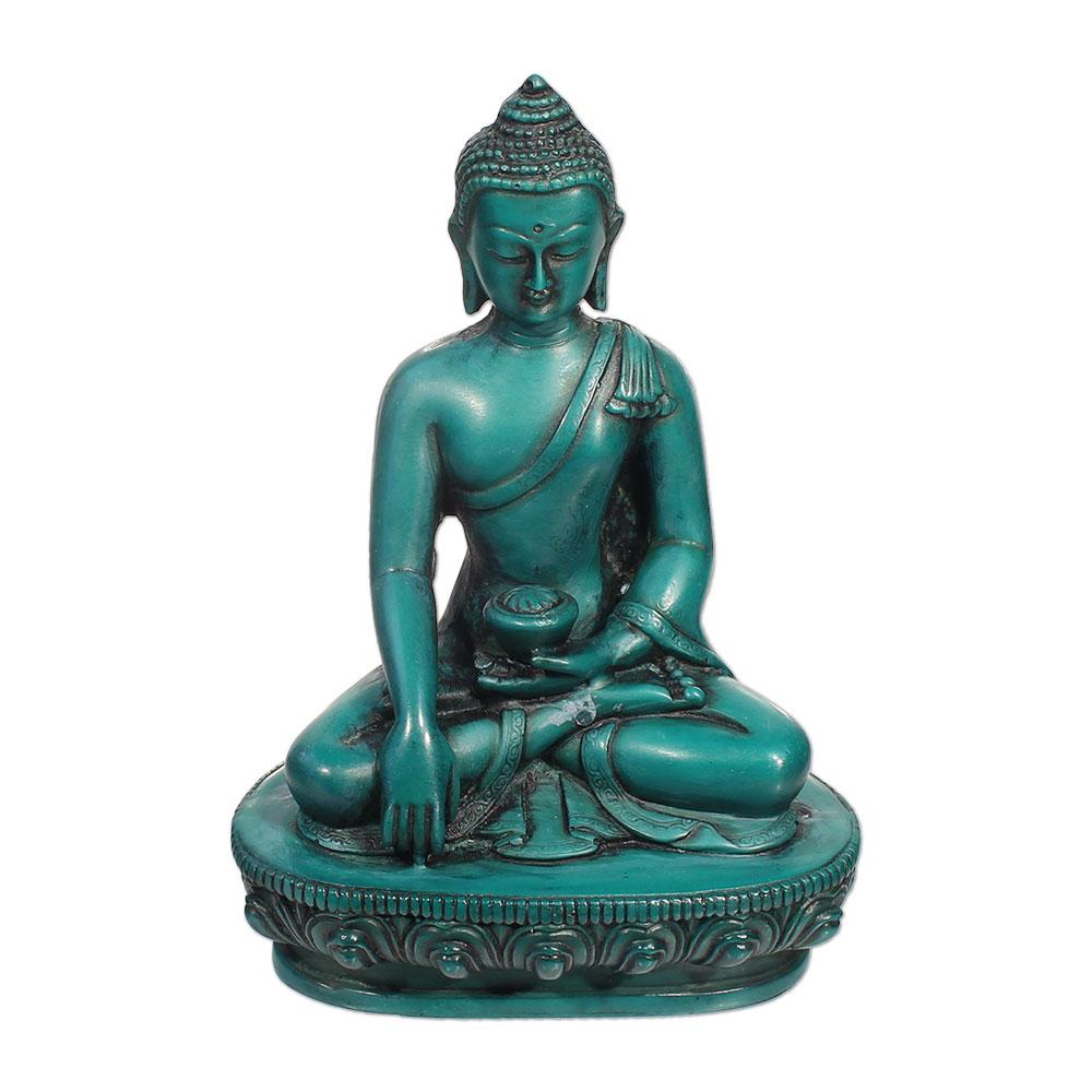 This resin formed Medicine Buddha statue holds in his right hand the stem of the Aruna fruit or Myrobalan between thumb and forefinger. The left hand rests on his lap, holding a jar of medicine. Statue is suitable for your home altar or other sacred space. Nepal.