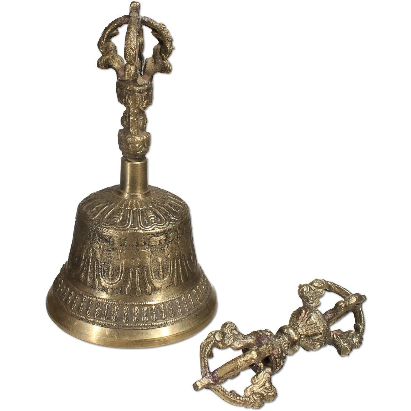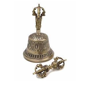 Bells are used symbolically by the dharma traditions of Buddhism, Jainism and Hinduism. The ritual hand bell symbolizes the feminine principle, the wisdom of emptiness. The accompanying dorje, also called a vajra ,is the symbol of spiritual authority of the peaceful deities. Beautifully and intricately decorated set is crafted in Nepal.