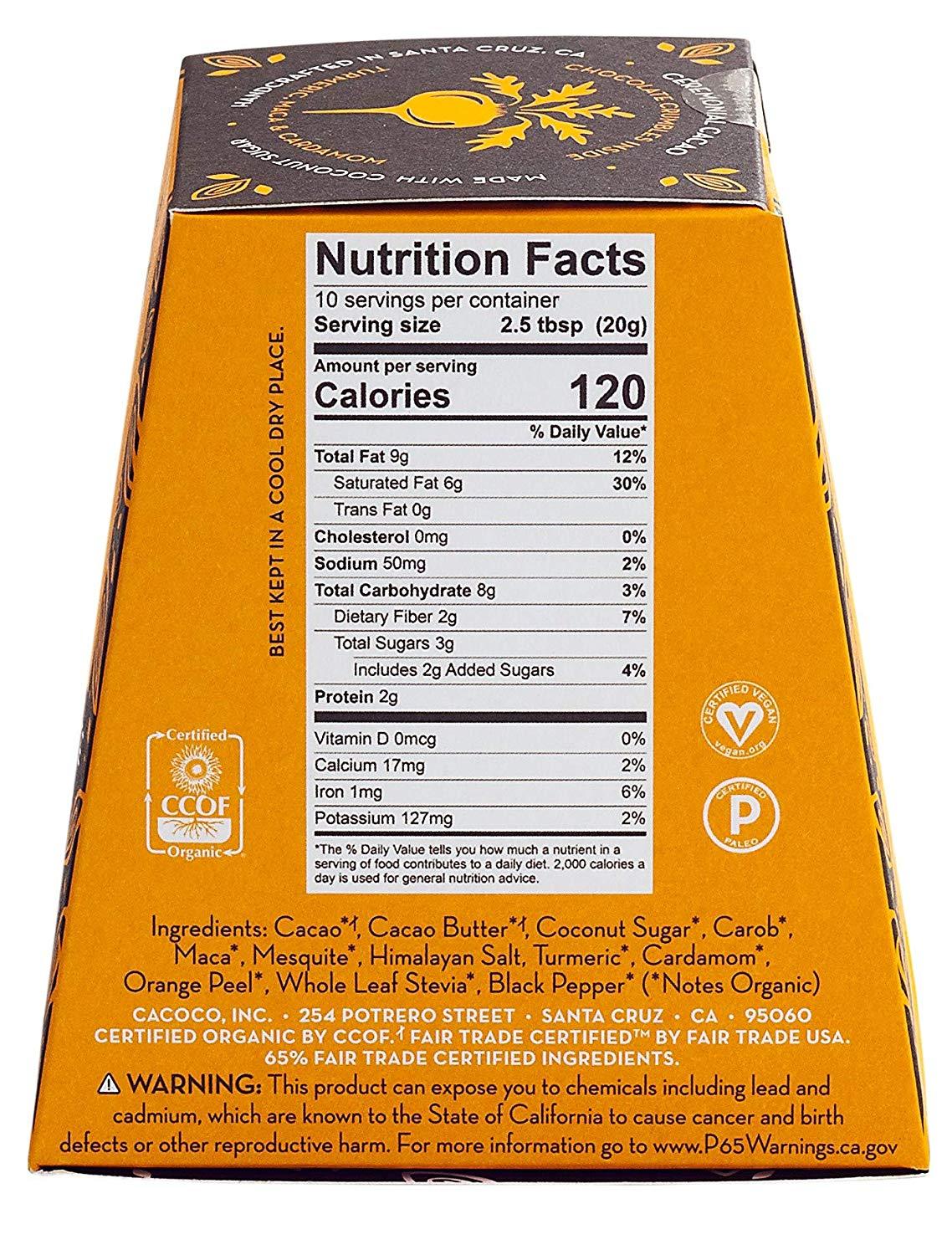 Ingredients: Organic Cacao, Organic Cacao Butter, Organic Coconut Sugar, Organic Carob, Organic Maca, Organic Mesquite, Himalayan Salt, Organic  Turmeric, Organic Cardamom, Organic Orange Peel, Organic  Stevia & Organic Black Pepper