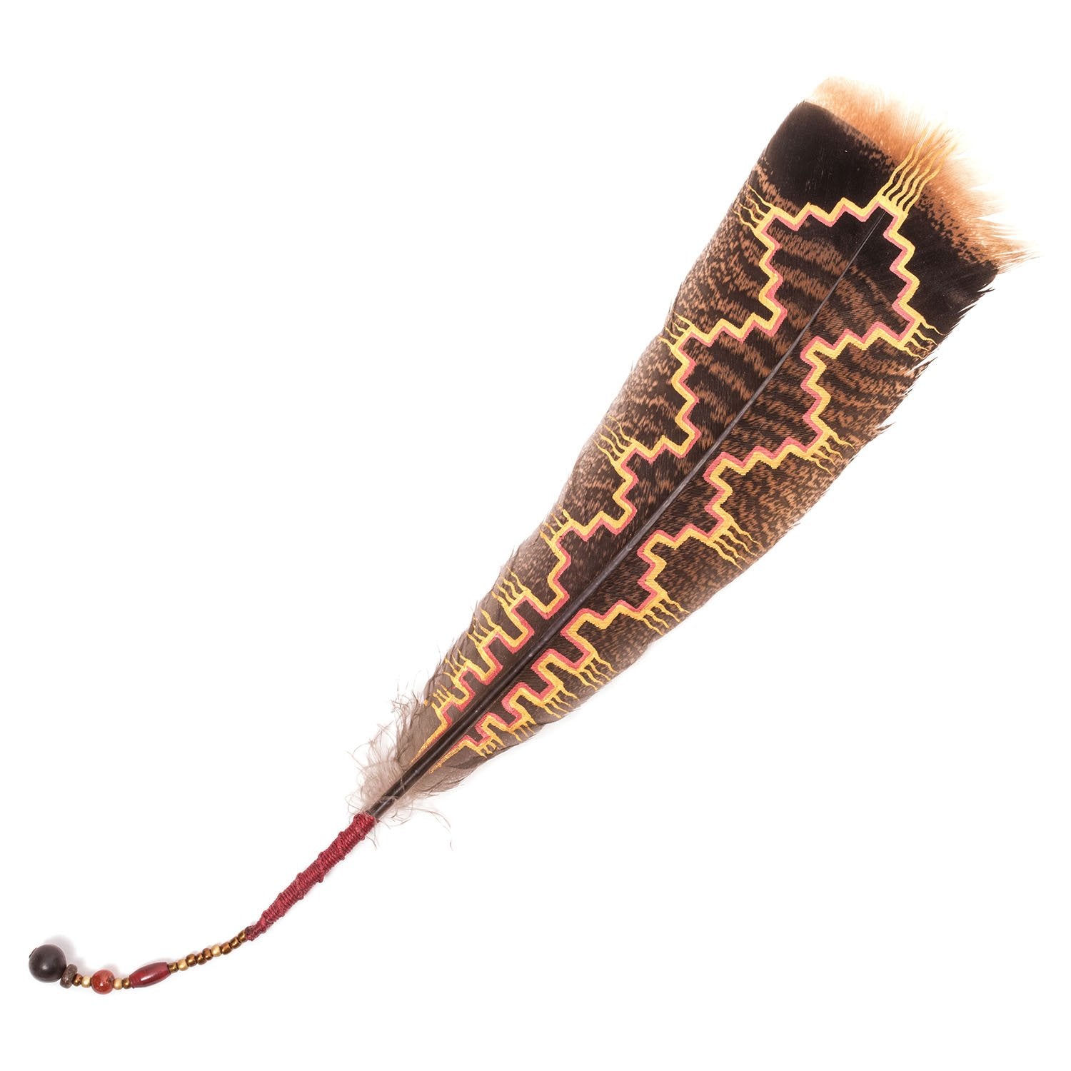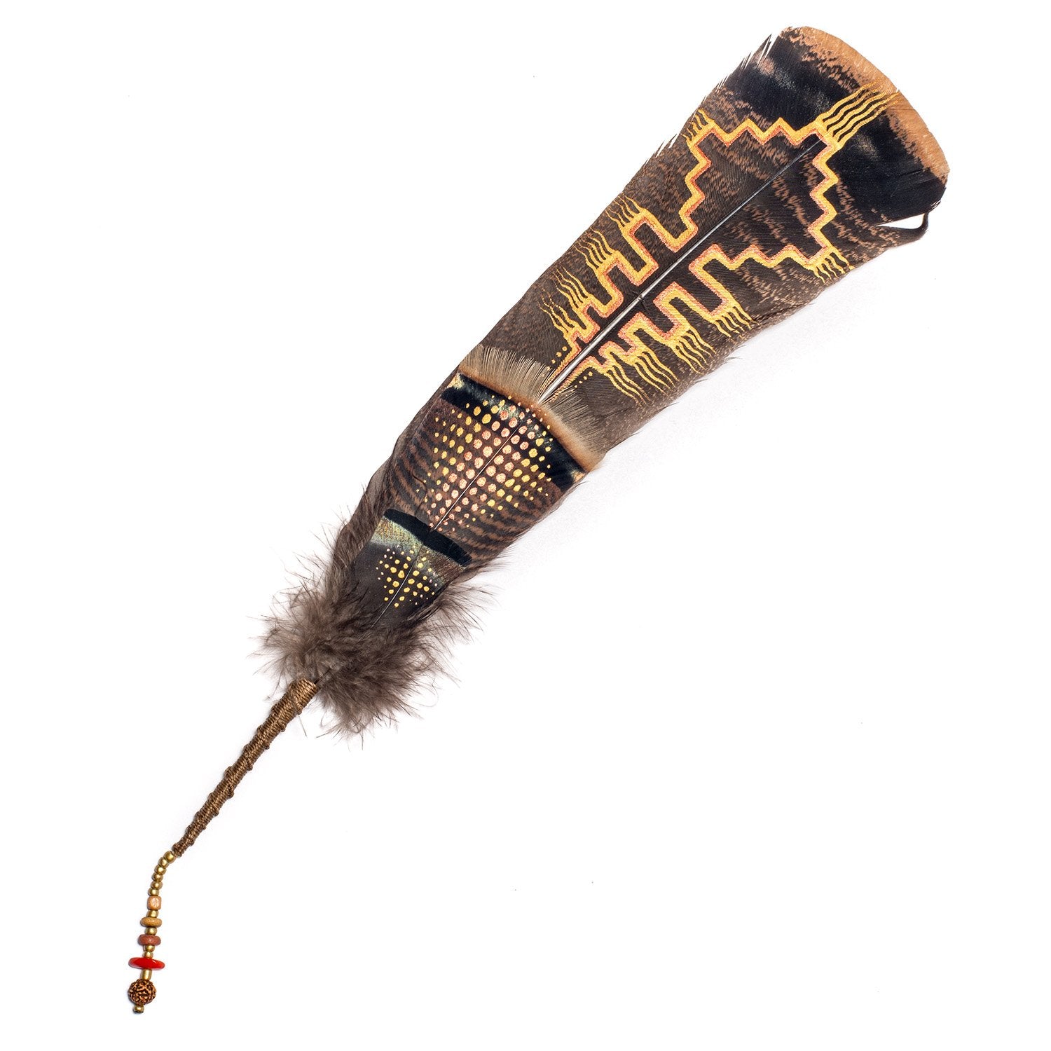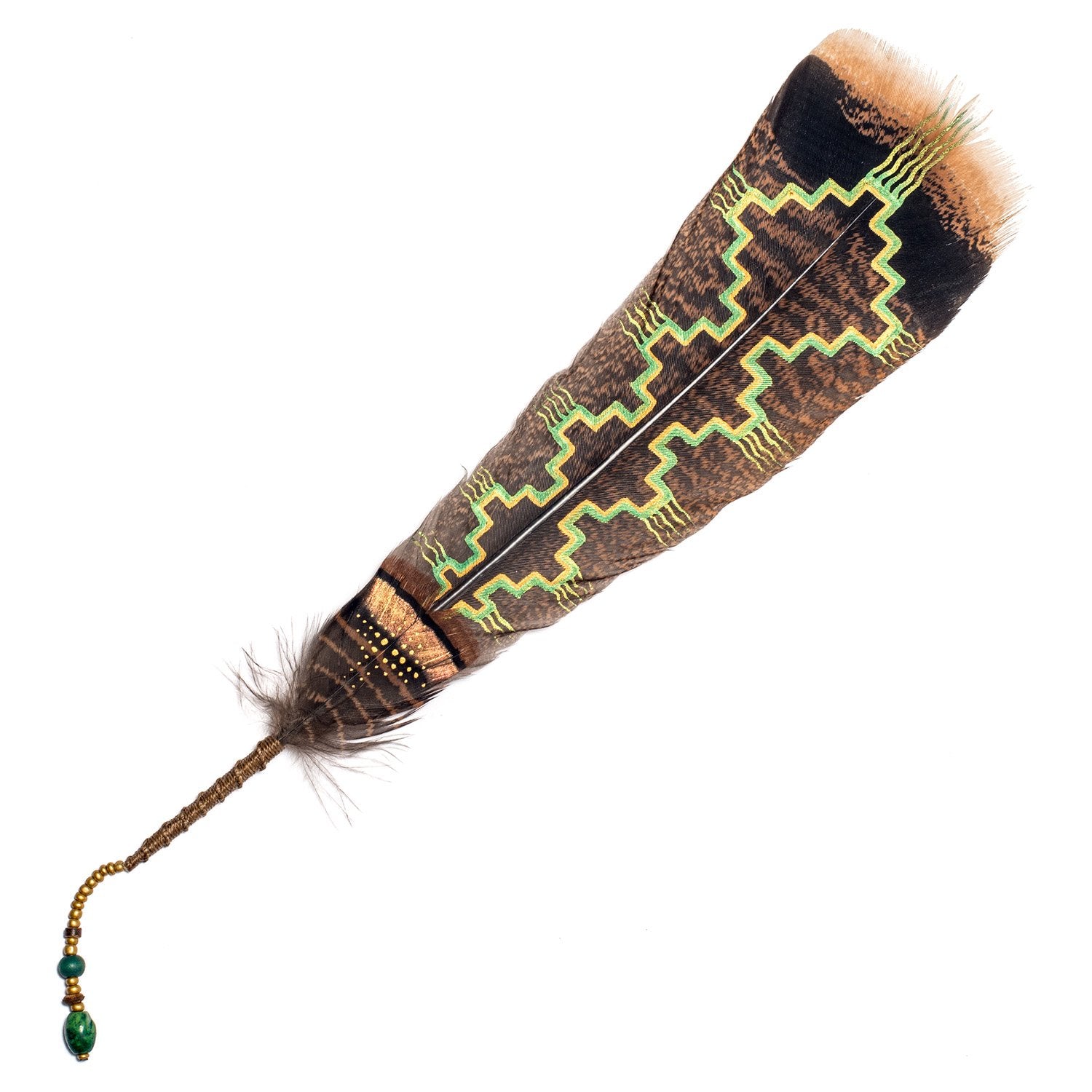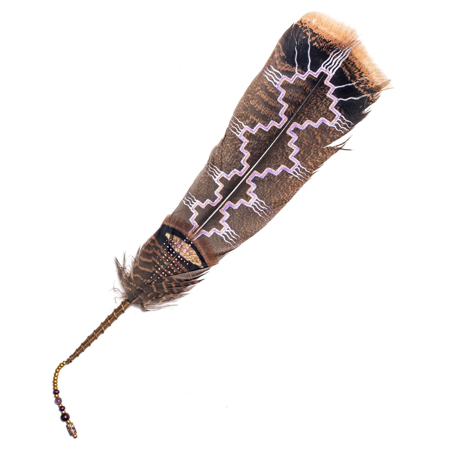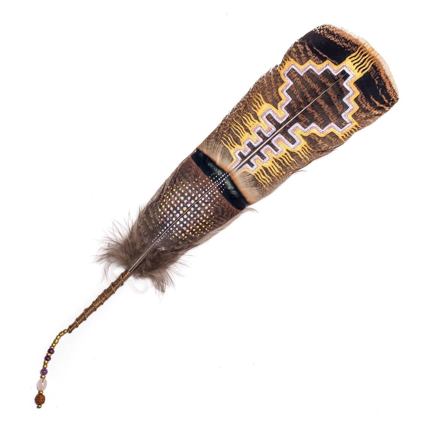 A beautiful and unique sacred shamanic tool. The painted design is a interpretation of the Incan Chacana. It represents, in part, the four sacred directions and the four elements of life and the link uniting Upper and Lower Realms. It also symbolizes the Sacredness of Life and the meeting of Masculine and Feminine principles with the vertical and horizontal lines. Quill tip is wrapped in macramé and embellished with beads. Use in your ceremonies for smudging, praying, healing, dancing and blessing. Your feather may differ slightly from the image due to the natural variance in feather sizes and shapes. Choice of chakana painted color.