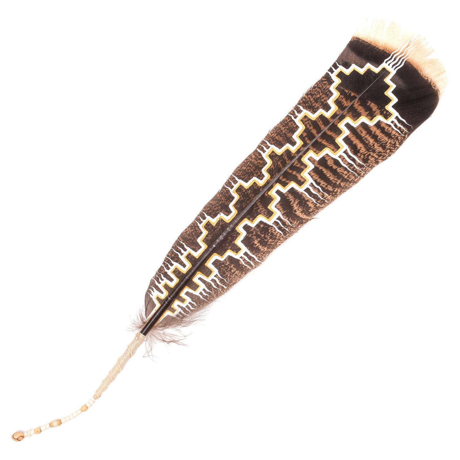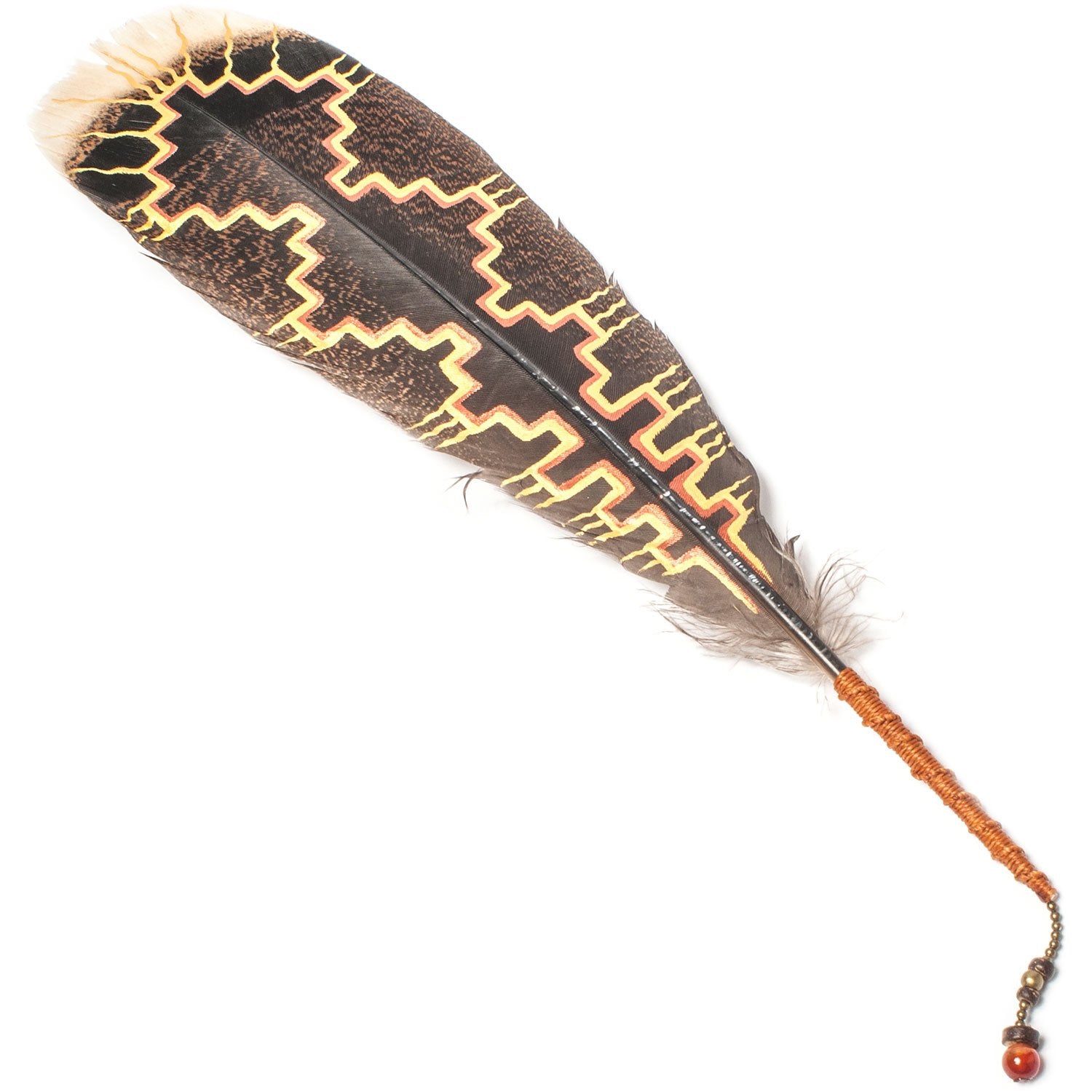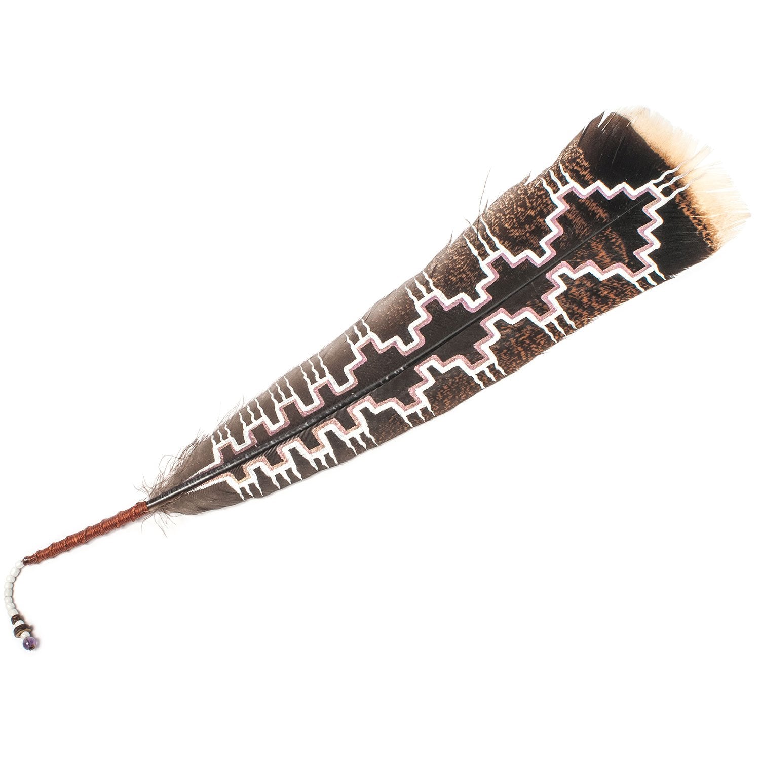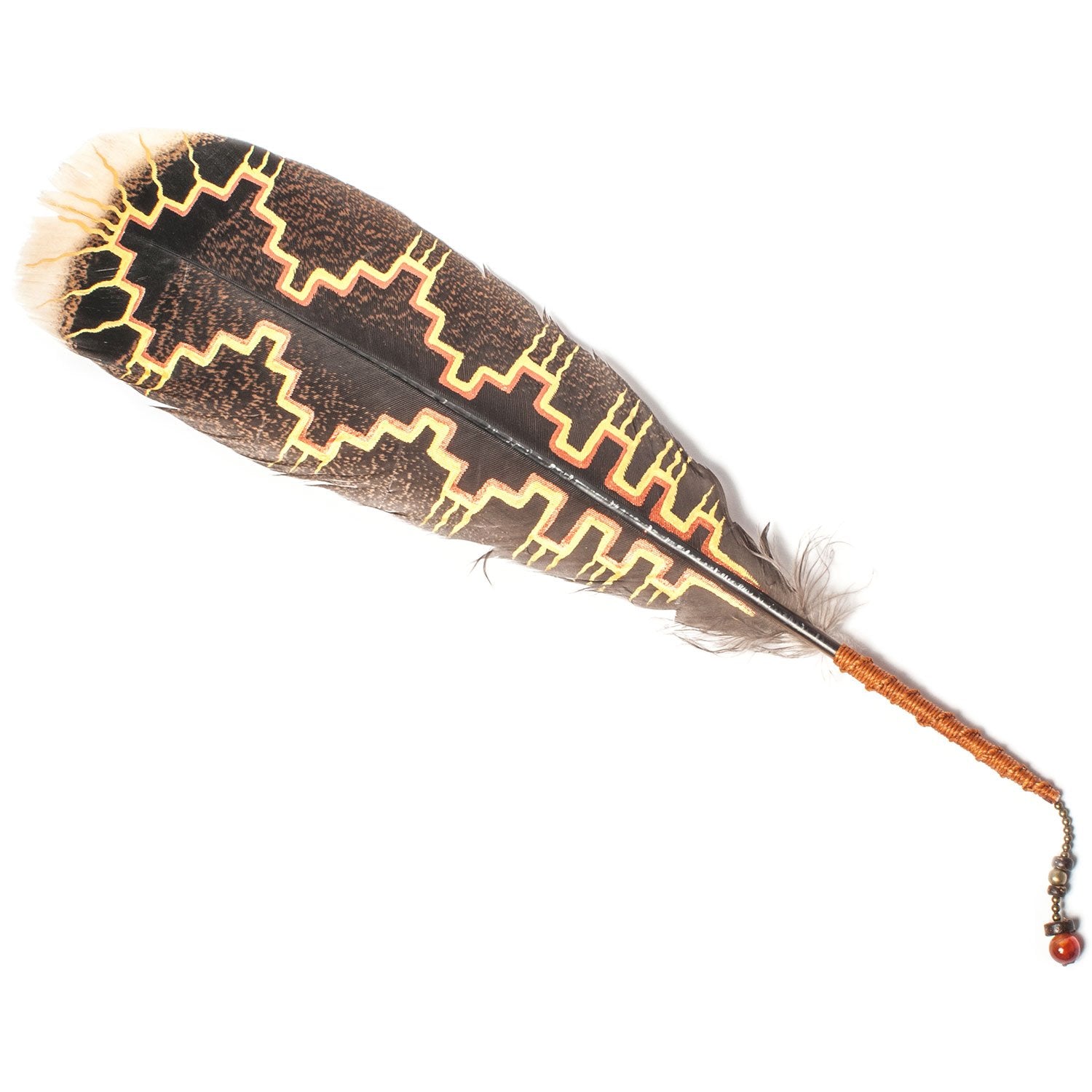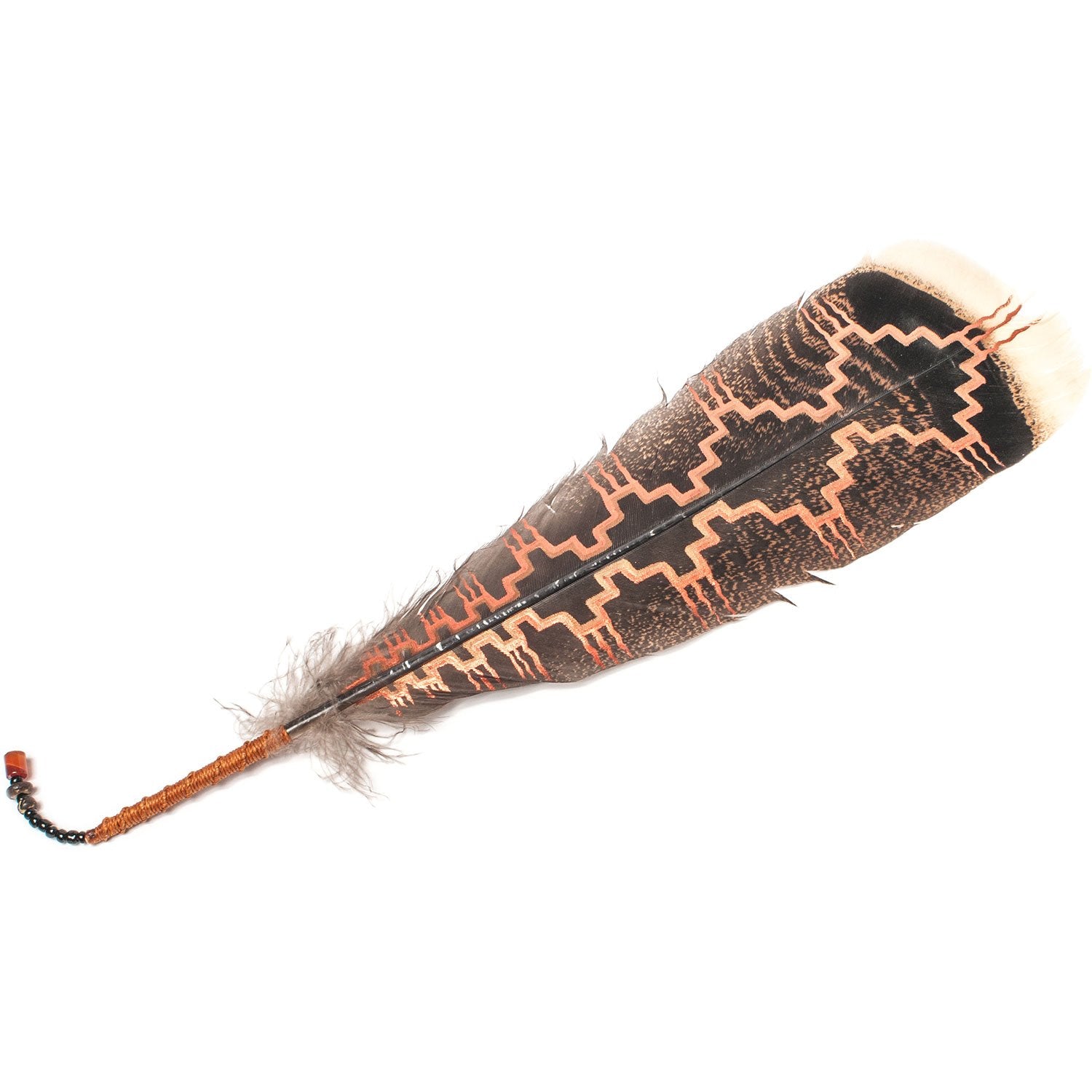 A beautiful and unique sacred shamanic tool. The painted design is a interpretation of the Incan Chacana. It represents, in part, the four sacred directions and the four elements of life and the link uniting Upper and Lower Realms. It also symbolizes the Sacredness of Life and the meeting of Masculine and Feminine principles with the vertical and horizontal lines. Quill tip is wrapped in macramé and embellished with beads. Use in your ceremonies for smudging, praying, healing, dancing and blessing. Your feather may differ slightly from the image due to the natural variance in feather sizes and shapes. Choice of chakana painted color.