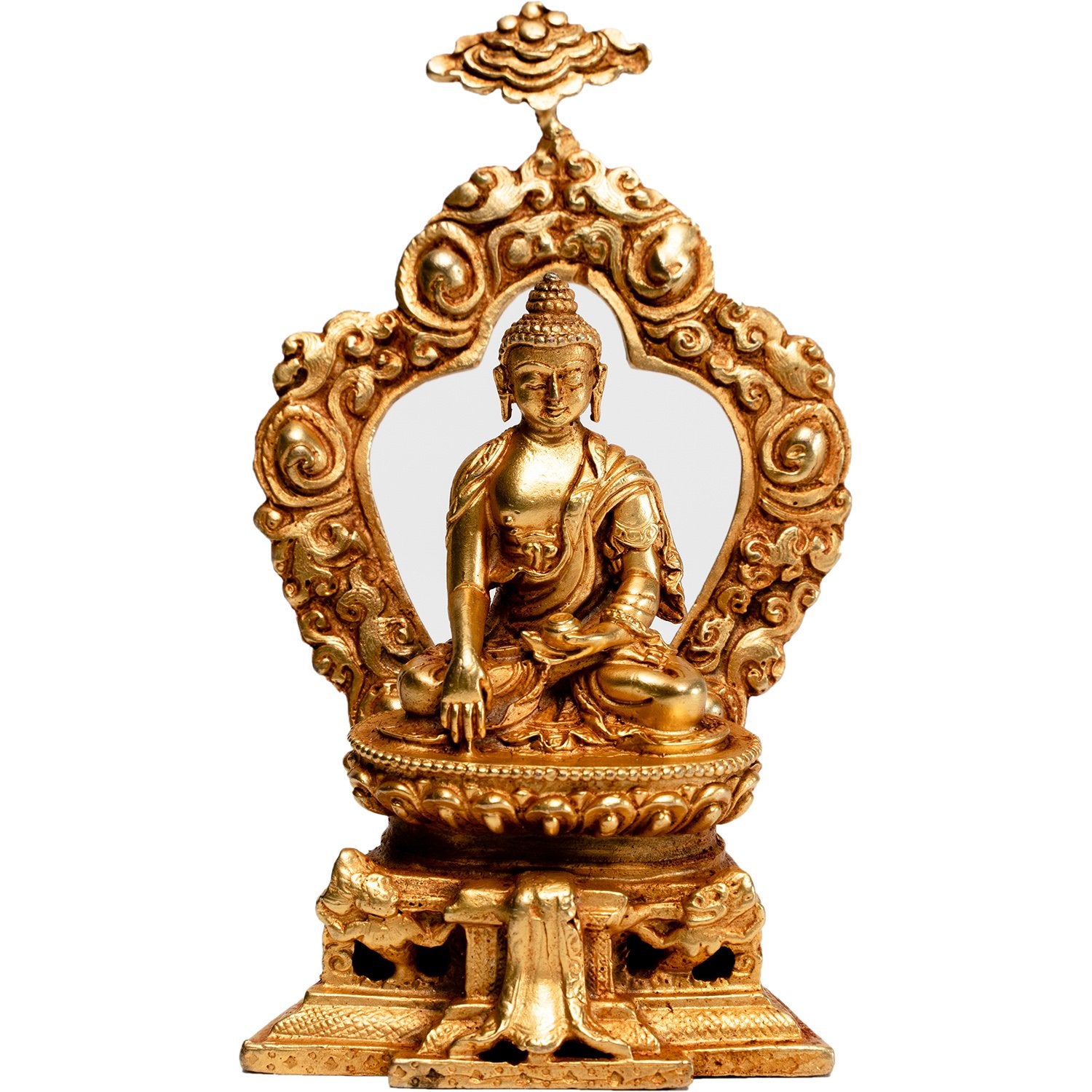 Shakyamuni Buddha Statue is seated in Dhyana Asana or Meditative Pose, also called Padmasana. In this position, the legs are crossed, closely locked with the soles of both feet visible. Lord Buddha is wearing a detailed carved monastic robe incised with floral motifs. He is seated on a single lotus base also known as Padmasana. His right hand is in the earth touching gesture or bhumisparsha mudra, while his left hand holds a medicine bowl.