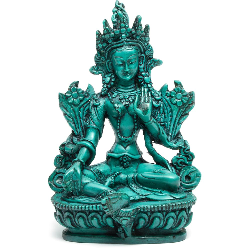 Our turquoise colored Green Tara statue is made from a resin and hydrostone mix. She is associated with enlightened activity and abundance. Here she is seated in her customary pose on a cushion of lotus flower pedals. While her left leg is folded in the contemplative position, her right leg is outstretched, ready to spring into action. Green Tara's left hand is in the refuge-granting mudra (gesture); her right hand makes the boon-granting (giving) gesture. Om Tare Tuttare Ture Soha is considered to be Green Tara's mantra, although sometimes it is used as the main mantra for all the 21 Tara forms. A perfect addition to your home altar. Hand made in Nepal.