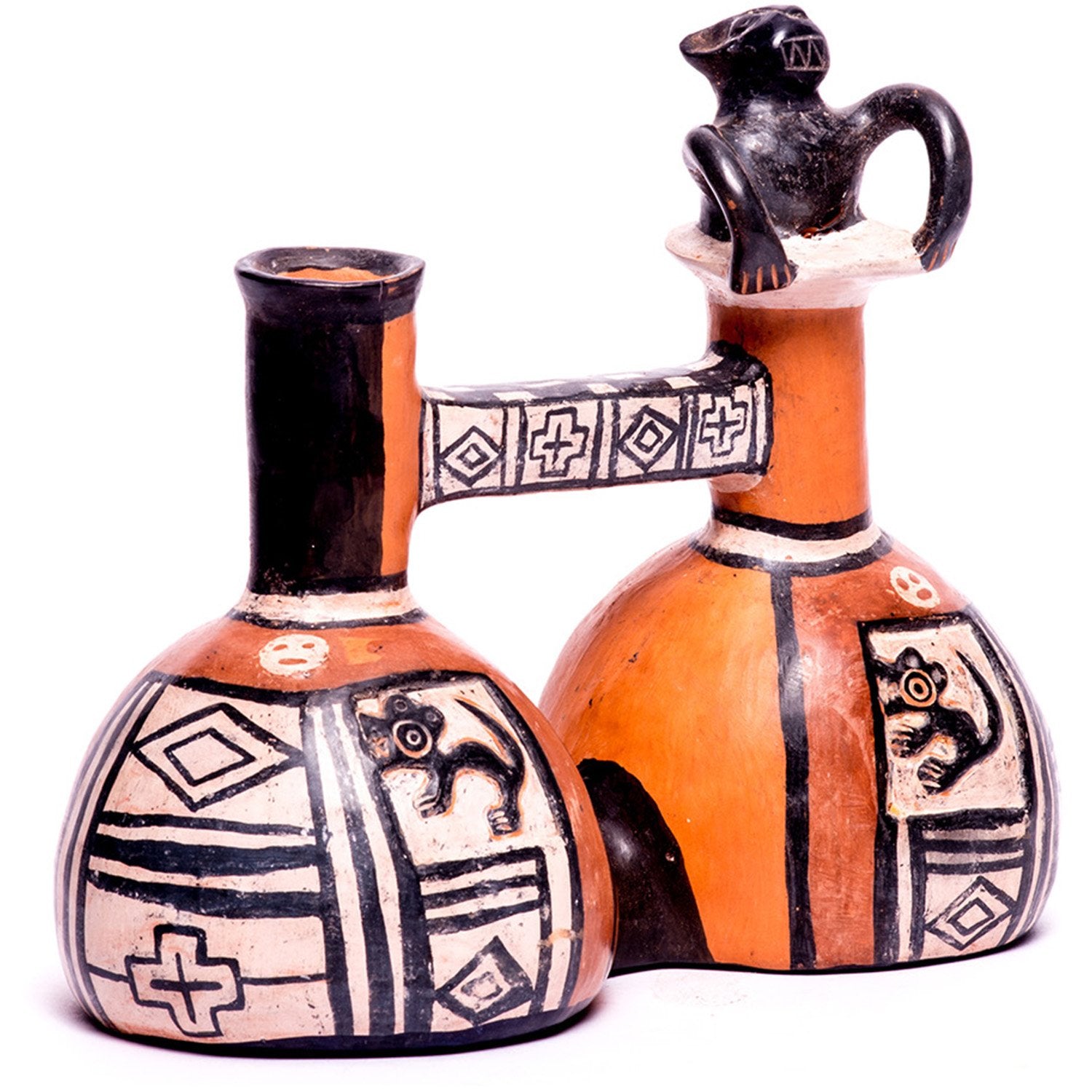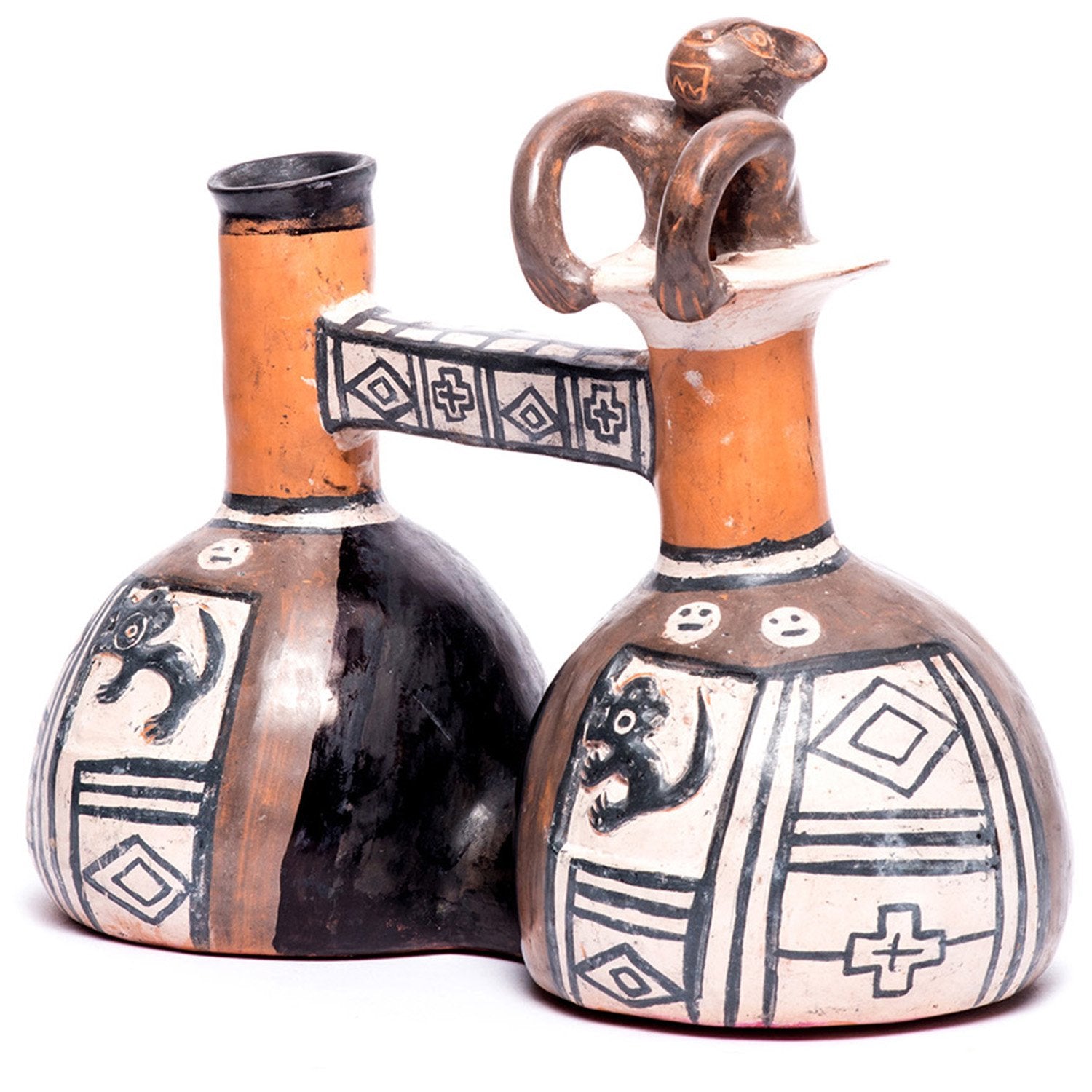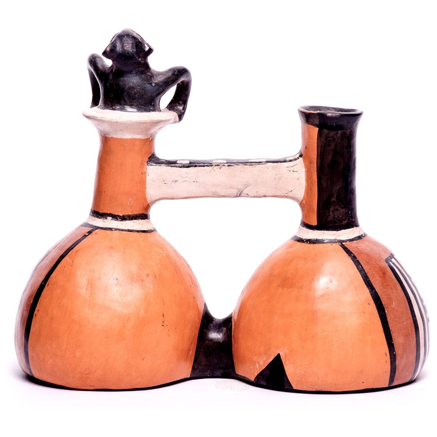 This chambered hollow clay replica of a pre-Columbian whistling vessel bears a zoomorphic form, likely of a jaguar, on its front chamber. Sculpted by ethnomusicologist Jose Vitancio Humeres of Peru, it is a replica of an original design. "I think the sounds these instruments make were to create positive energy," says Vitancio Humeres. Constructed of two chambers, as well as a system of air ducts and aqueducts, the vessel is filled partially with water, and when held and tipped, pushes the air outward to create melodic sounds, through one or more whistle holes. Exquisitely made. The whistle on this piece works with a strong sound. A functional musical instrument and a brilliant piece of art. Made in Peru.