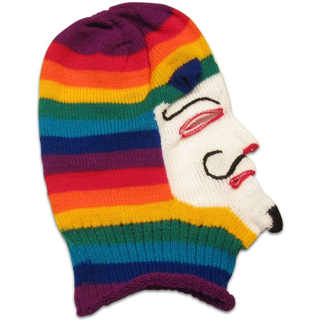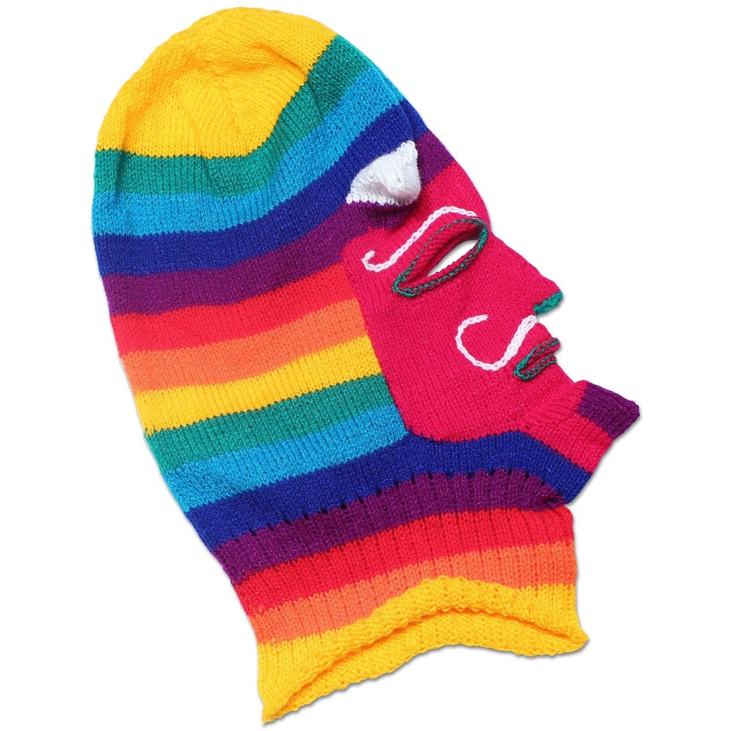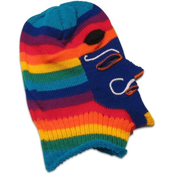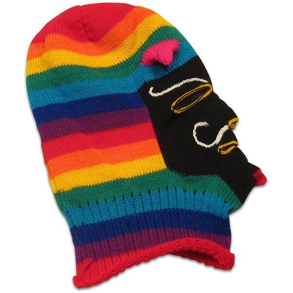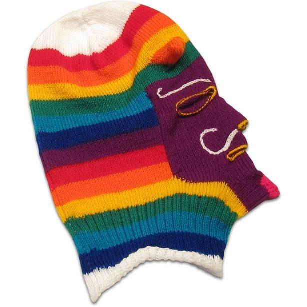 Rainbow striped knitted mask with contrasting eyebrows and face. Pulls over the head and has eye, nose and mouth openings. Wool face masks, such as this one, are called waq'ollos in Quechua, a local Peruvian dialect. Primarily worn and seen during the Peruvian Festival of Qoyllur Riti, [Lord of the Snow Star] ceremonies, you can wear yours on the slopes or to in the snow. 13 inches long by 9.5 inches wide when measured flat. Accent colors may vary. One size fits most. Made in Peru.