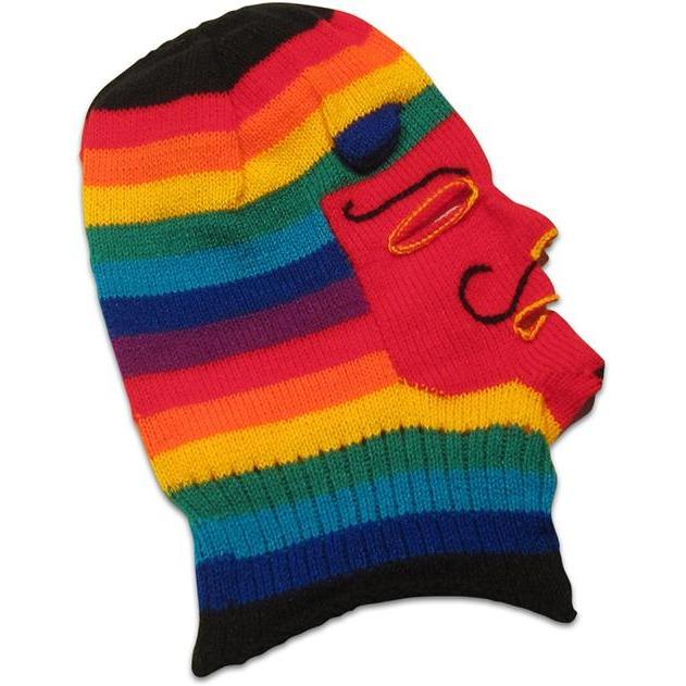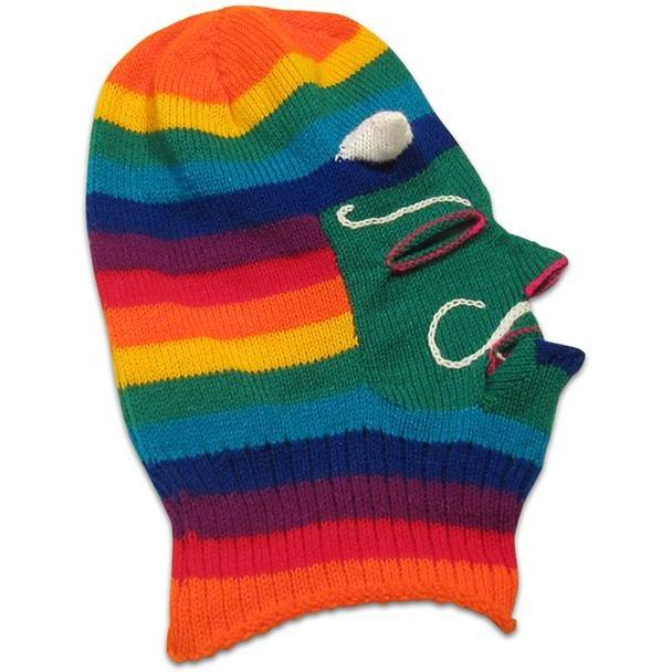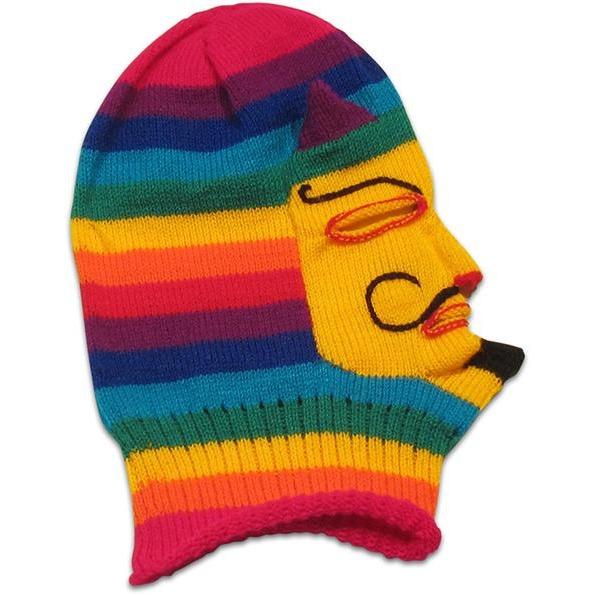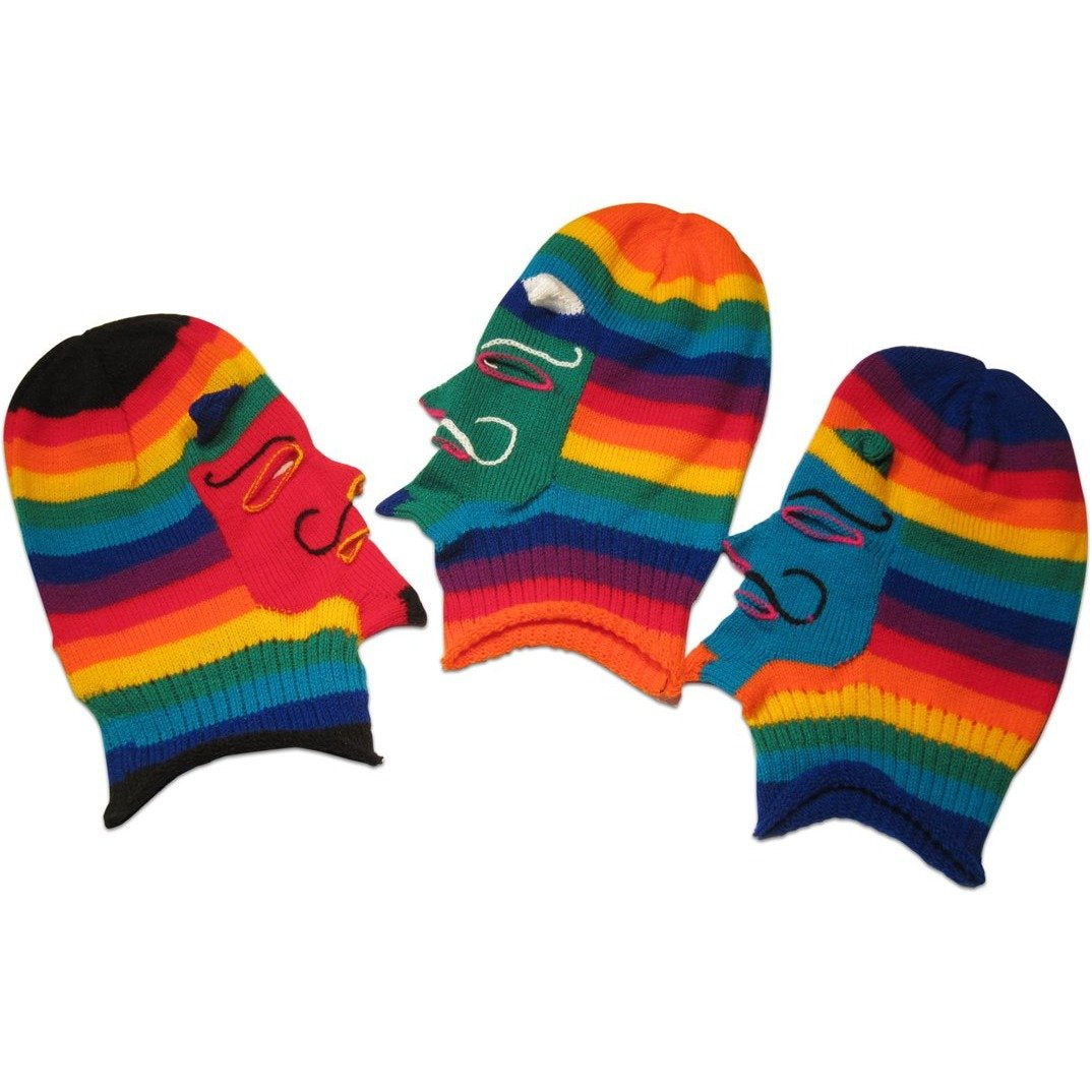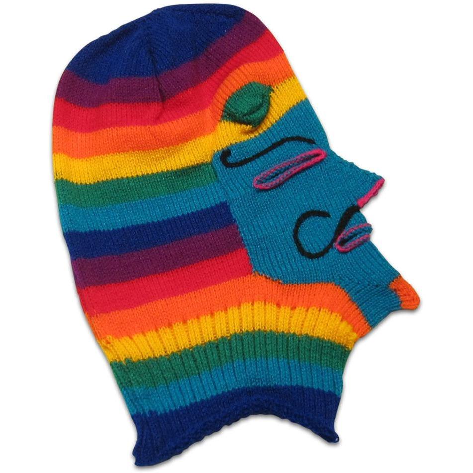 Rainbow striped knitted mask with contrasting eyebrows and face. Pulls over the head and has eye, nose and mouth openings. Wool face masks, such as this one, are called waq'ollos in Quechua, a local Peruvian dialect. Primarily worn and seen during the Peruvian Festival of Qoyllur Riti, [Lord of the Snow Star] ceremonies, you can wear yours on the slopes or to in the snow. 13 inches long by 9.5 inches wide when measured flat. Accent colors may vary. One size fits most. Made in Peru.