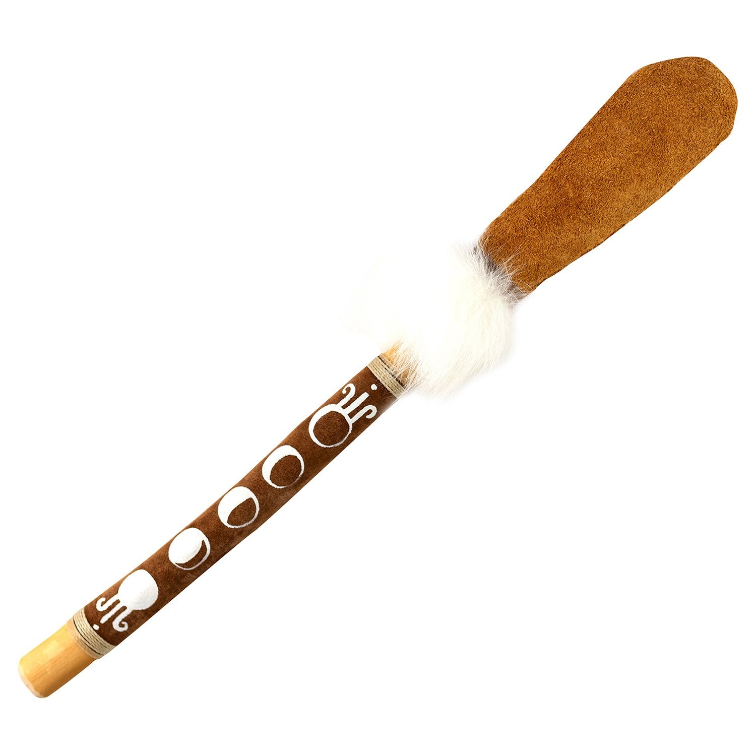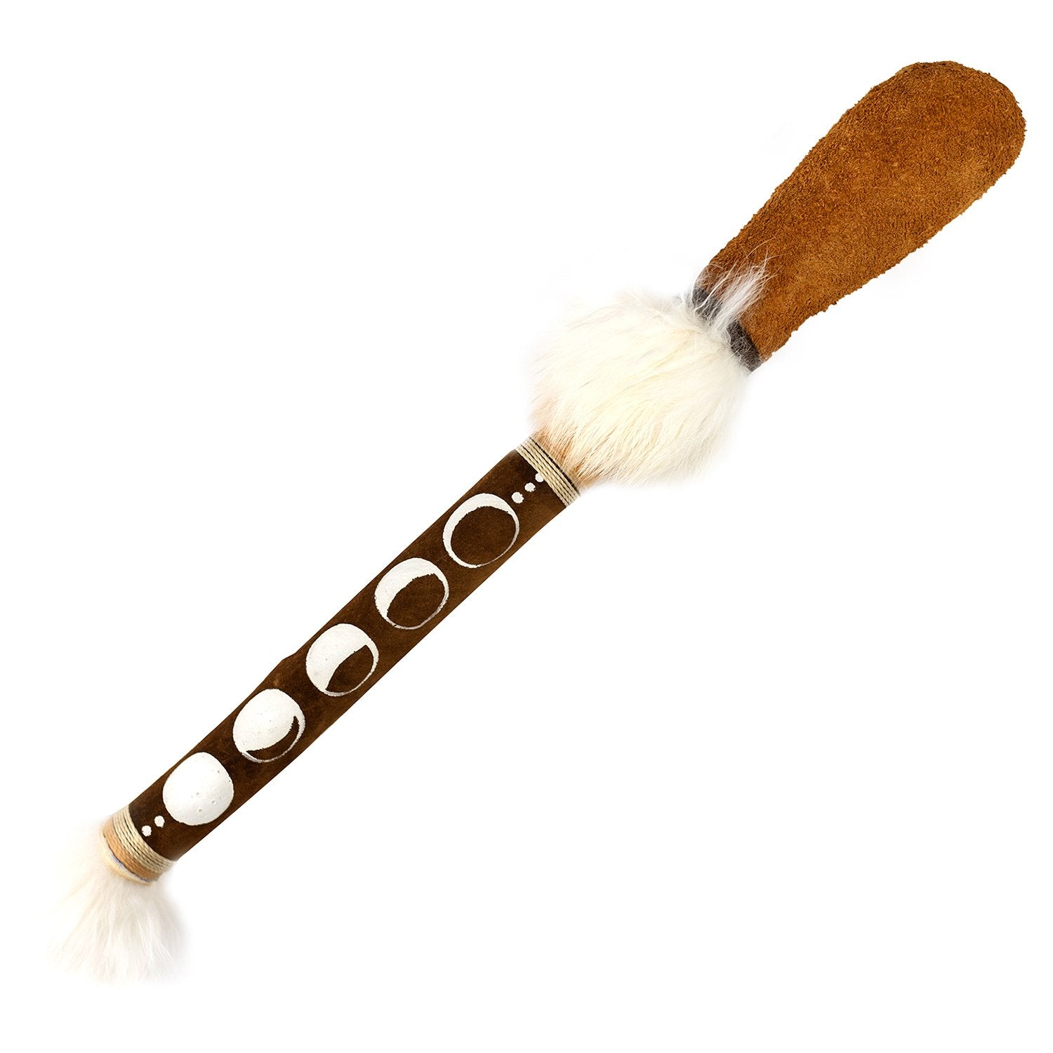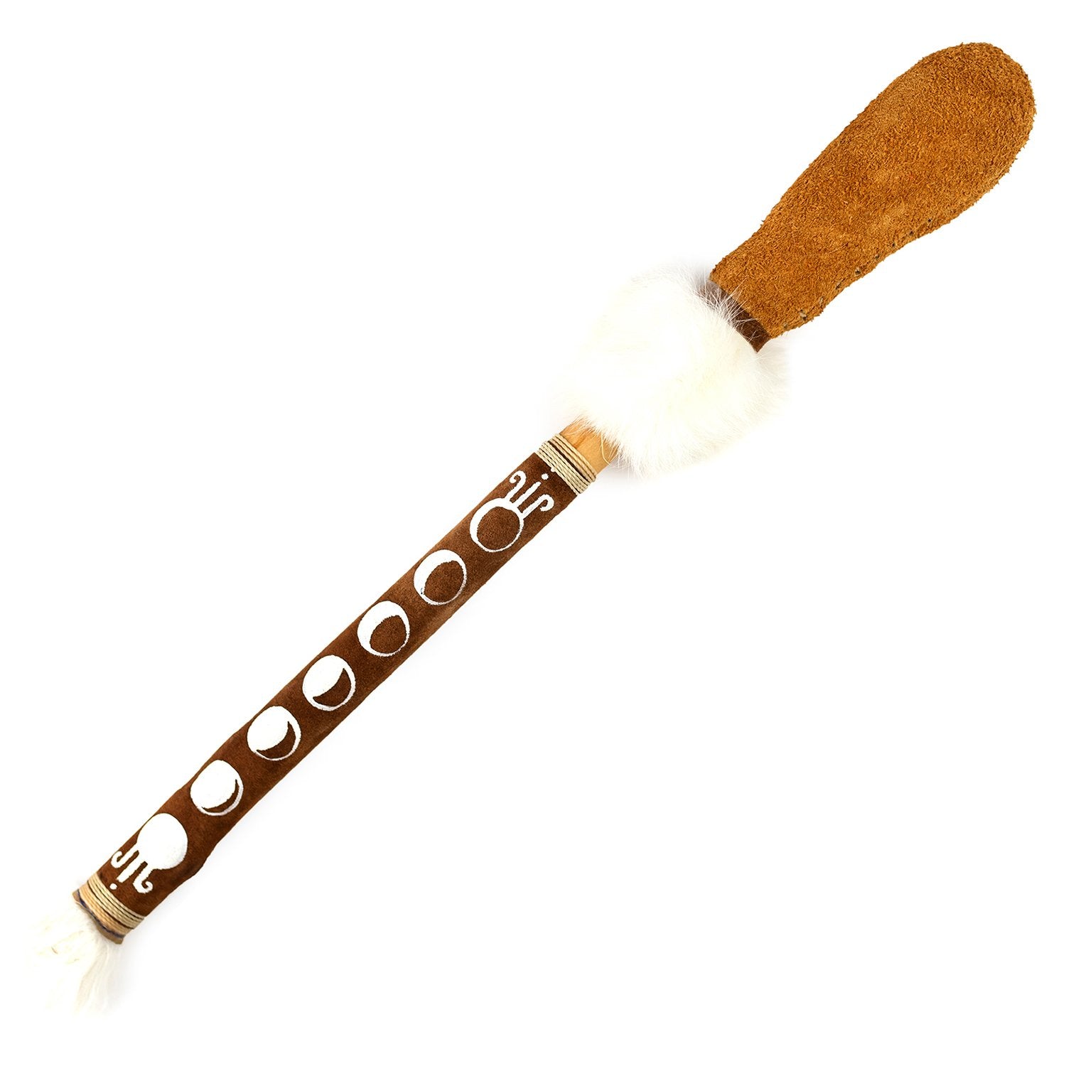 The handle is covered with leather that was glued to stay in place. A hand painted Moon Cycle deign on the handle adorned with natural rabbit fur. They are about 13-16 inches in length.