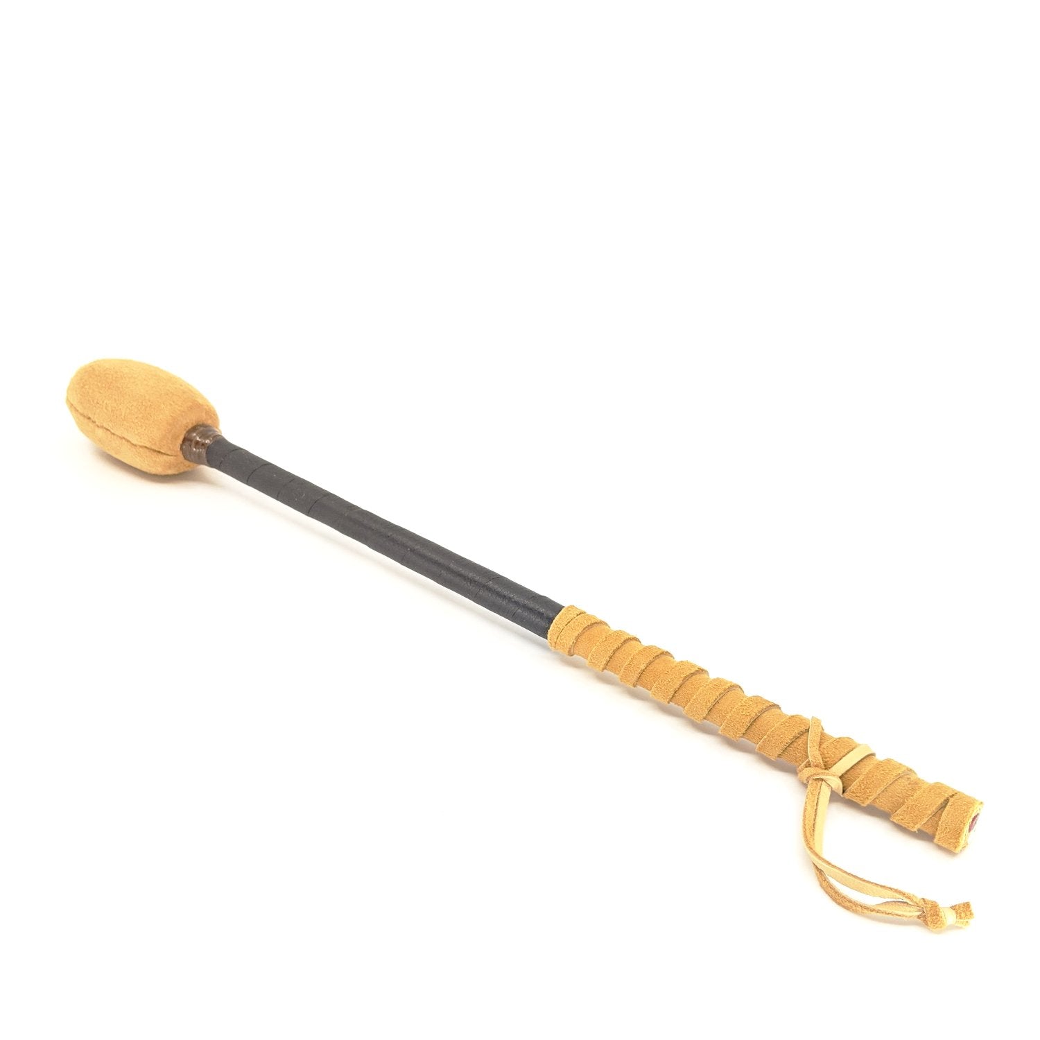 16 in drum stick with spiral-wrapped two tone deer hide handle. Medicine wheel painting on bottom of handle is the makers signature. Beater end measures 1/2 inch wide x 3 long, providing a lighter, thinner, more flexible yet strong drumstick offering less fatigue during use. Designed for use on hand drums, but great for other related percussion instruments. Native American made.
