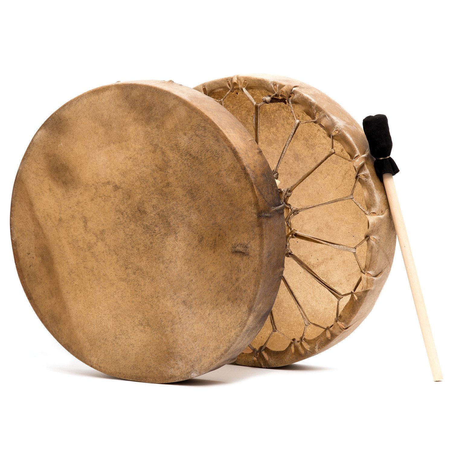 Hand-held Native American inspired frame drums are perfect for drum circles, shamanic healing, meditation, and personal or ceremonial rituals. The drums are laced onto a separate piece of rawhide for even pressure, preventing tearing. Drum handles are wrapped in leather and made to slide your hand underneath so it fits like a glove and is easy to hold and beat. Includes a buckskin beater.