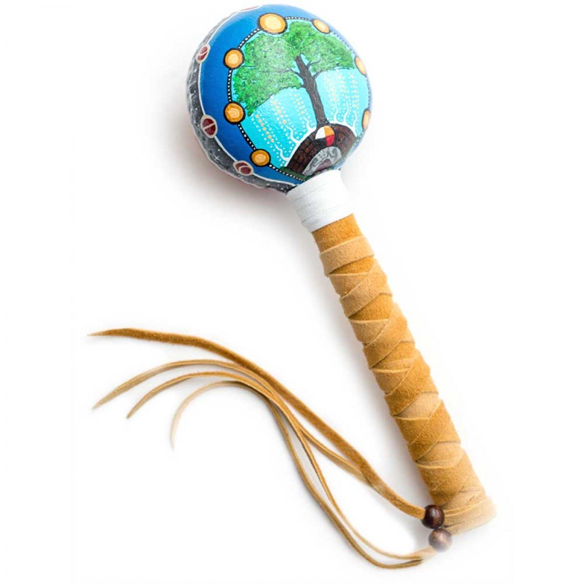 Handcrafted by Native American Artist and Shaman. Made in the traditional plains style. Authentic and Practical. This is a handcrafted Full Size Rattle with deer hide leather weaved wrap and white deer hide at top. This rattle contains a Sacred Creek Rock Fill. The artwork depicts the spiritual representation of the Tree of Life. Perfect for ceremony and meditation.