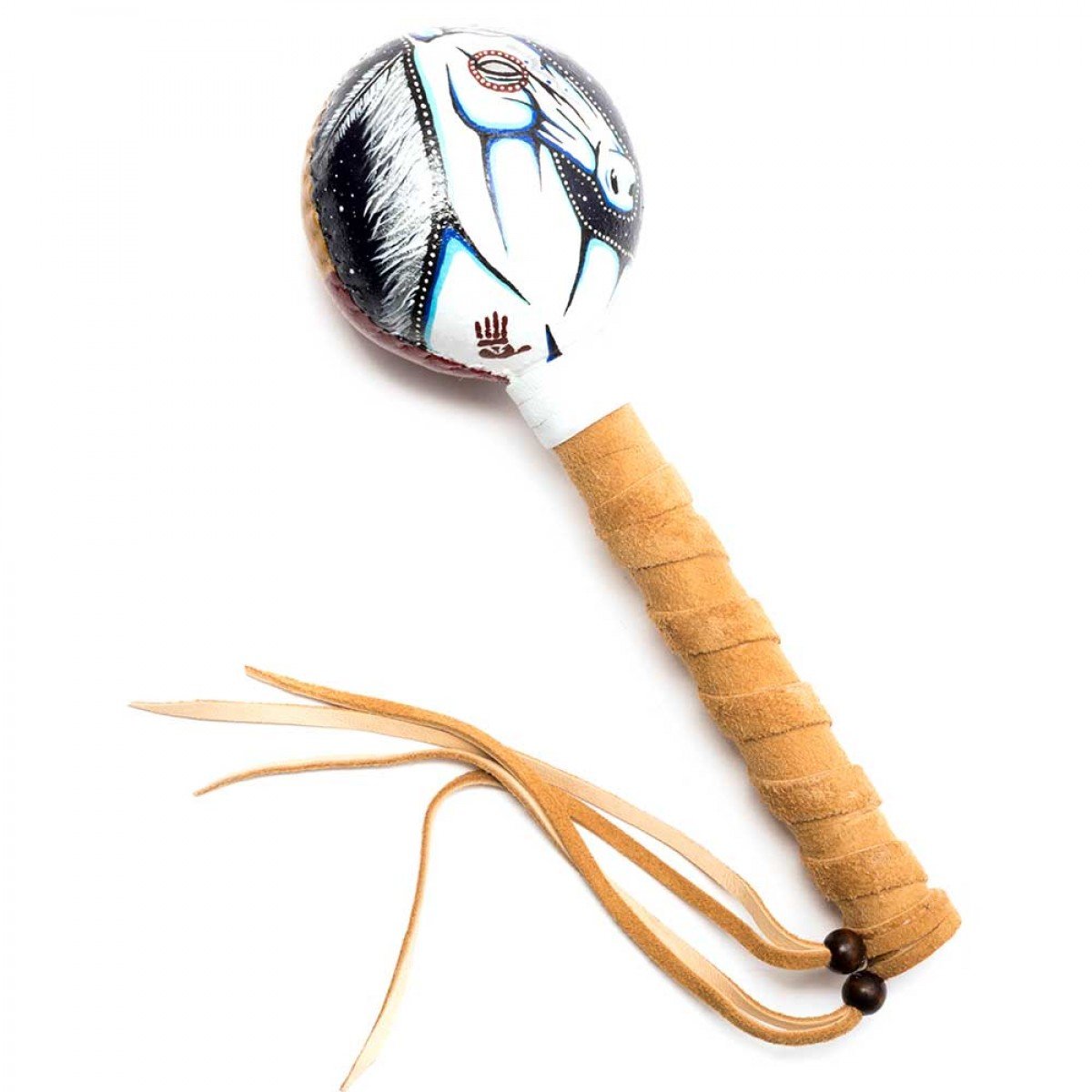 Authentic Native American handmade rattle. Made in the traditional plains style, this rattle is a handcrafted full size rattle with full leather weaved wrap and deer hide handle. This rattle contains a Sacred Creek Rock fill for a strong sound. The artwork depicts the spiritual embodiment of the White Horse totem. Perfect for ceremony and meditation. 9 inches long in total. 4 inch handle. Handmade in the USA.