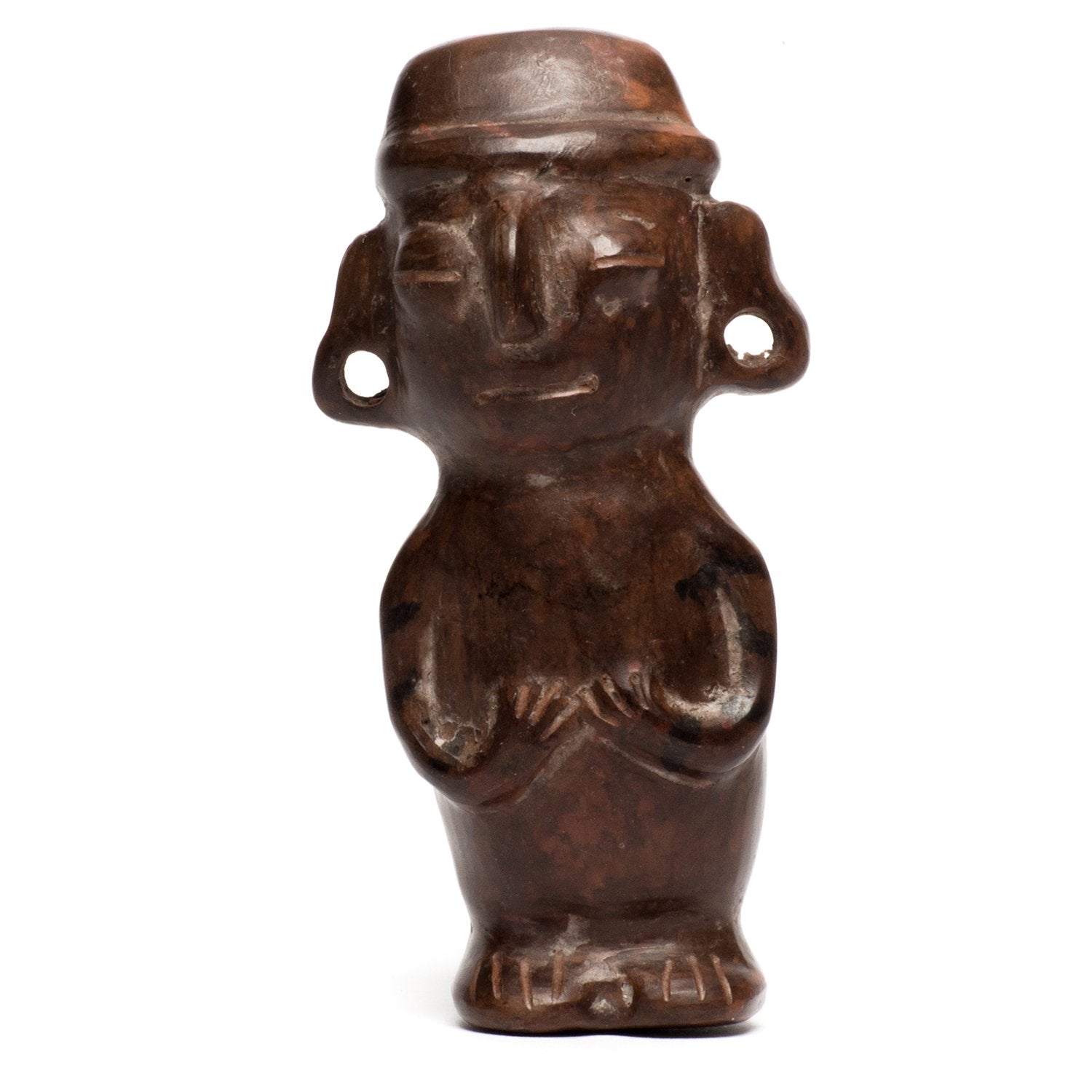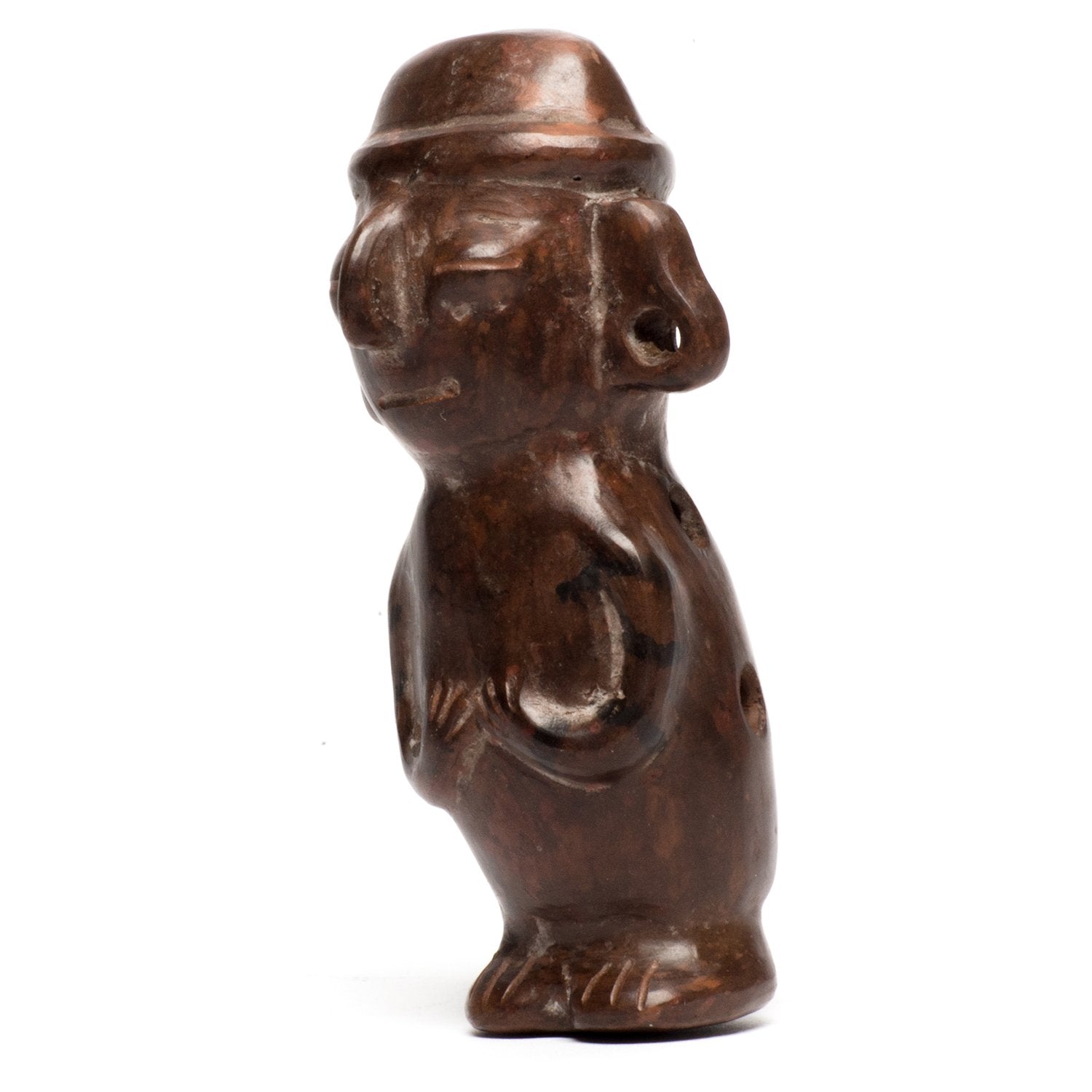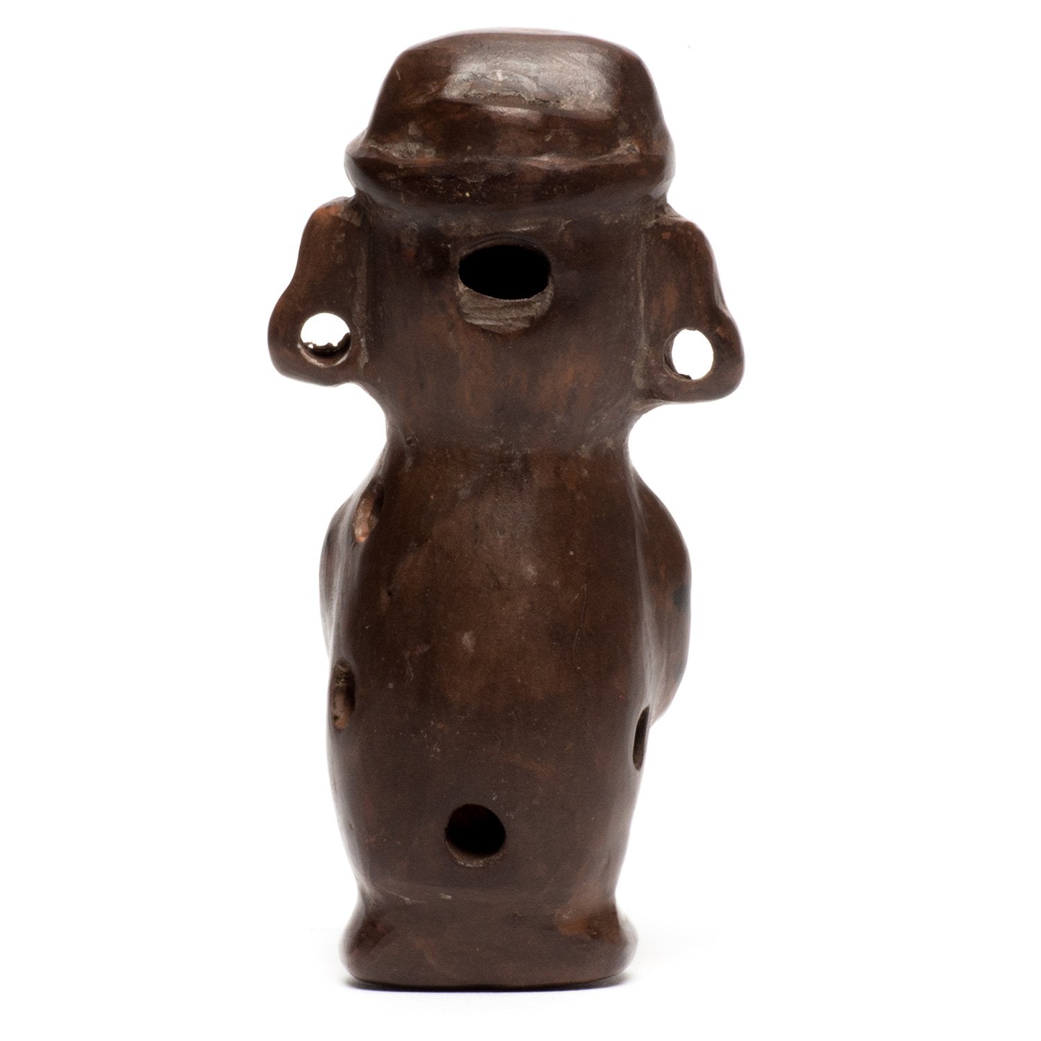 This hand made clay ocarina bears the form of man from the Vicus era of Peruvian history. Sculpted by ethnomusicologist Jose Vitancio Humeres of Peru, it is a replica of an original design. "I think the sounds these instruments make were to create positive energy," says Vitancio Humeres.
