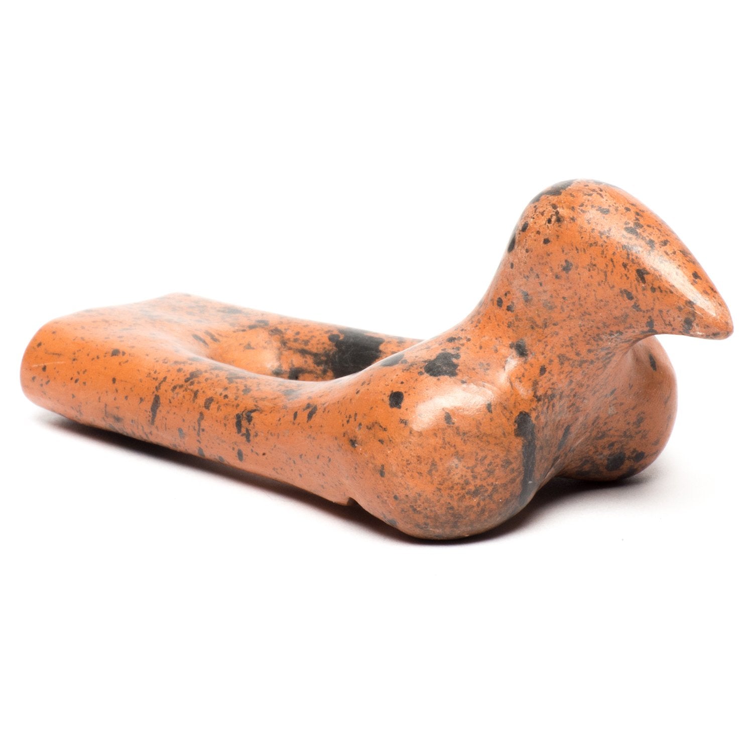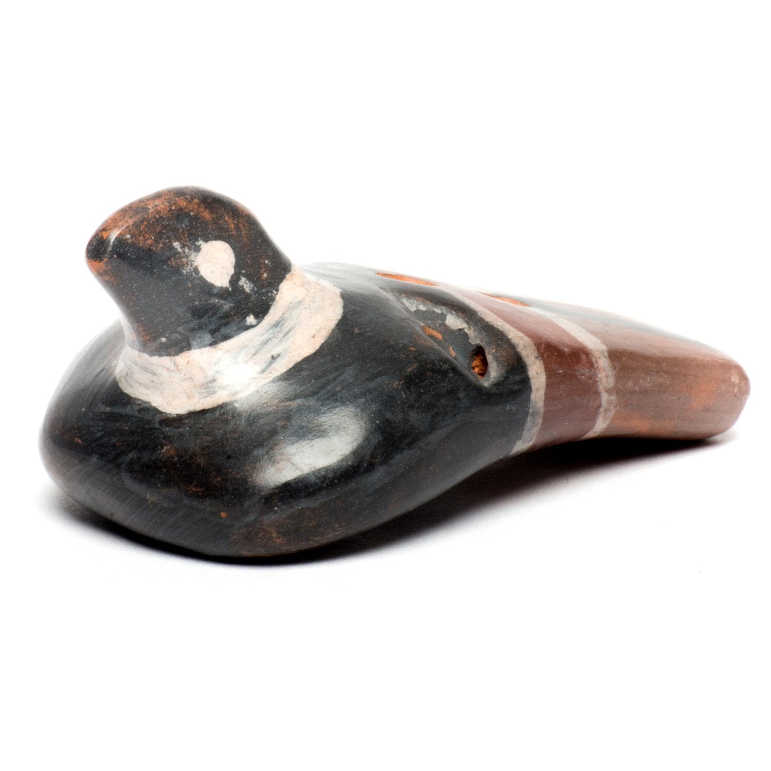 Constructed of two whistles, two notes simultaneously create a unique and harmonic sound. These ocarins can be used to clear an energy field, healing work or shamanic trance. The whistle on this piece works with a strong sound. A functional whistling vessel and a brilliant piece of art. Made in Peru.
