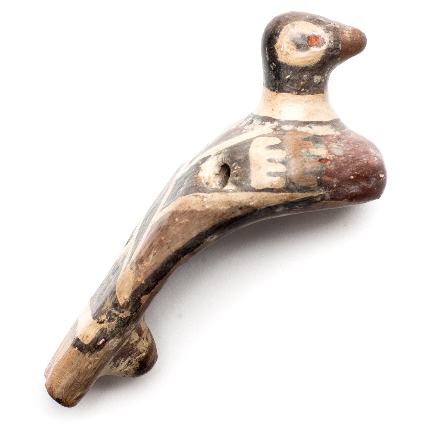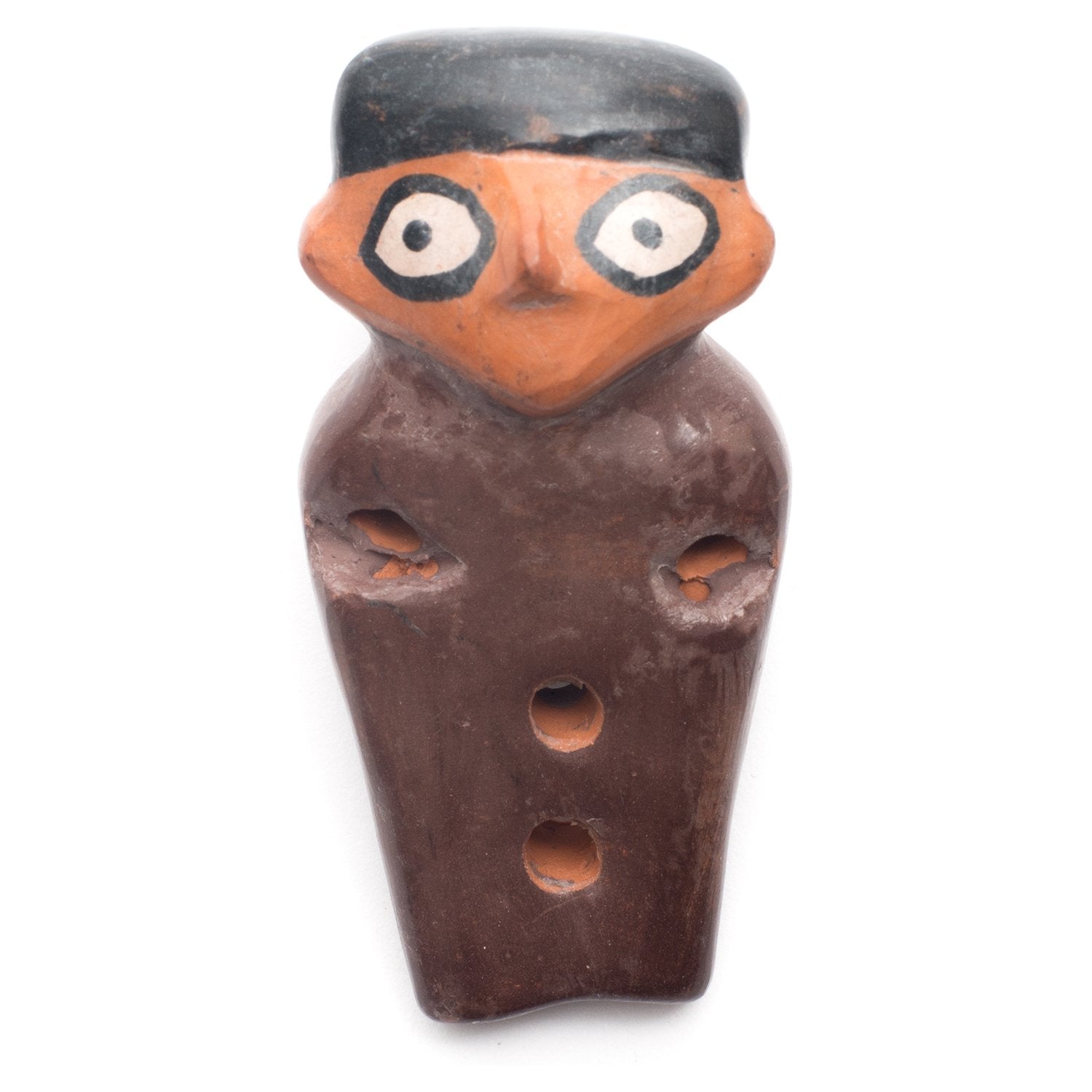 These clay ocarinas are hand made reproductions of pre-Incan designs and sculpted by ethnomusicologist Jose Vitancio Humeres of Peru. Vitancio Humeres says he thinks the sounds these instruments make were to create positive energy.