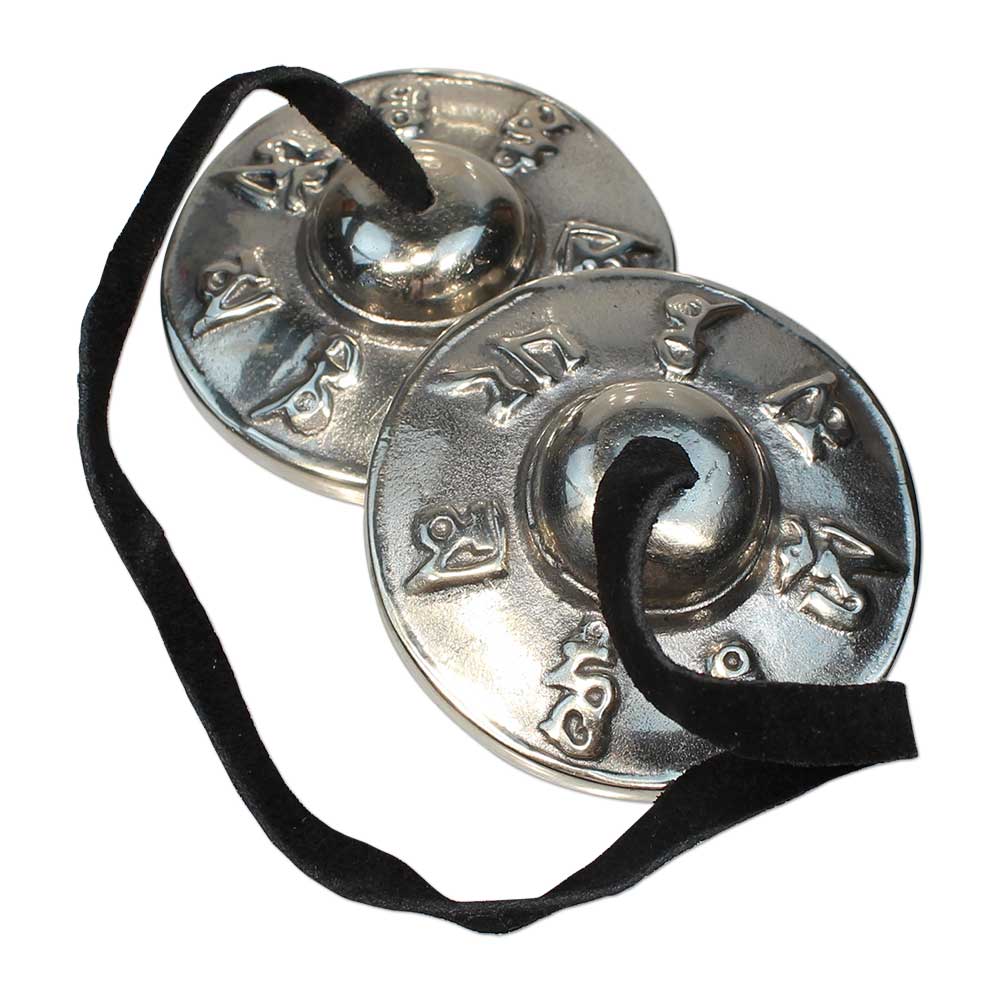 Tibetan tingshas are traditionally used for meditation, ritual ceremonies and as an elegant and powerful decorative element. Our set is called the Om Mani Tingsha because it is inscribed with the symbols for each sound of the well known mantra: Om Mani Padme Hum. Strung on a rustic leather cord. Reverse side also etched with Tibetan symbols. A perfect tool for meditation and yoga. Handcrafted in Nepal.