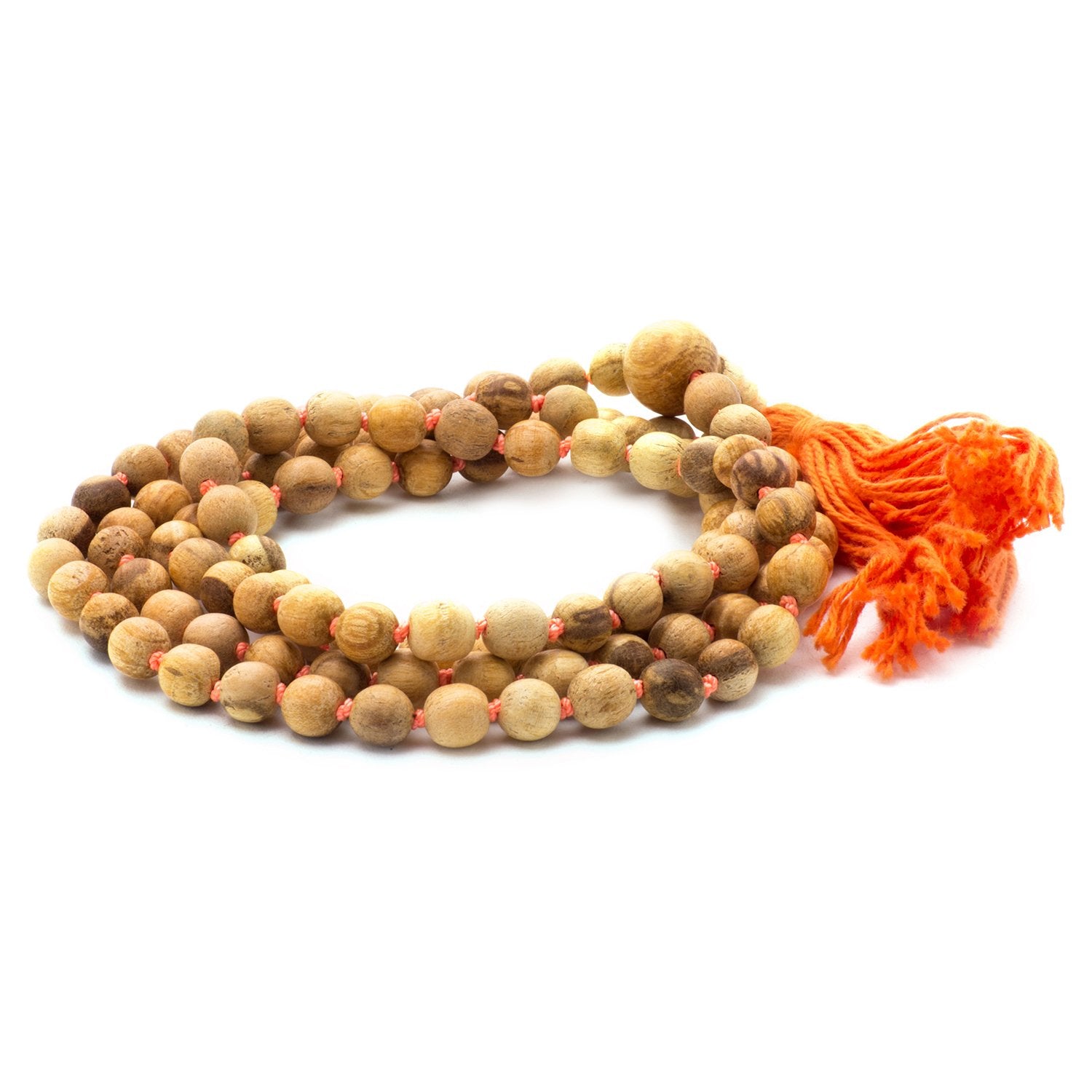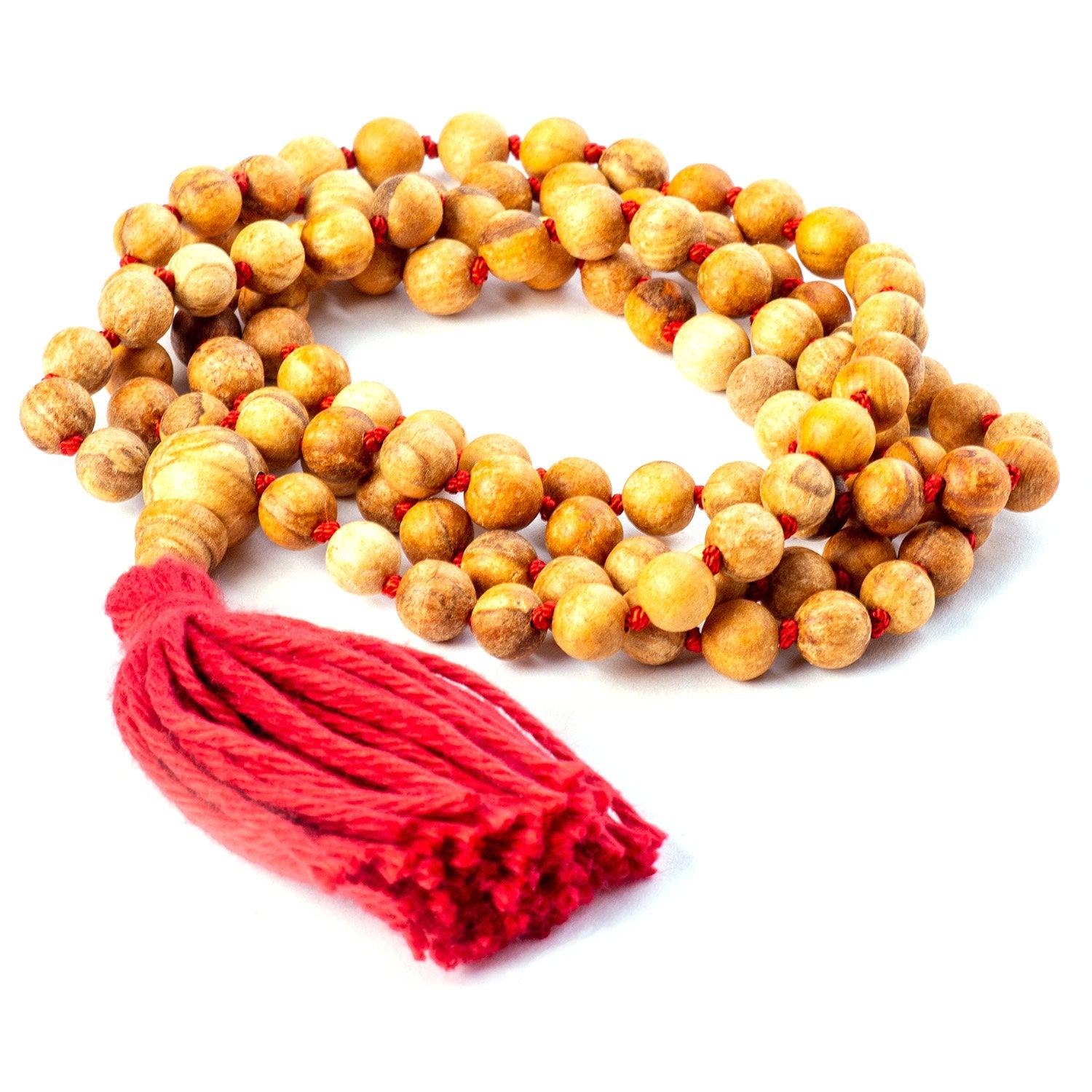 East meets West! The fragrance of Palo Santo wood from South America has now been strung into prayer beads commonly used by Hindus, Buddhists and some Sikhs for the spiritual practice known in Sanskrit as japa. 108 beads. 7/8 mm. Guru bead also made from the palo santo wood. Knotting between beads for ease of moving fingers around the beads when saying prayers. Red yarn tassel.