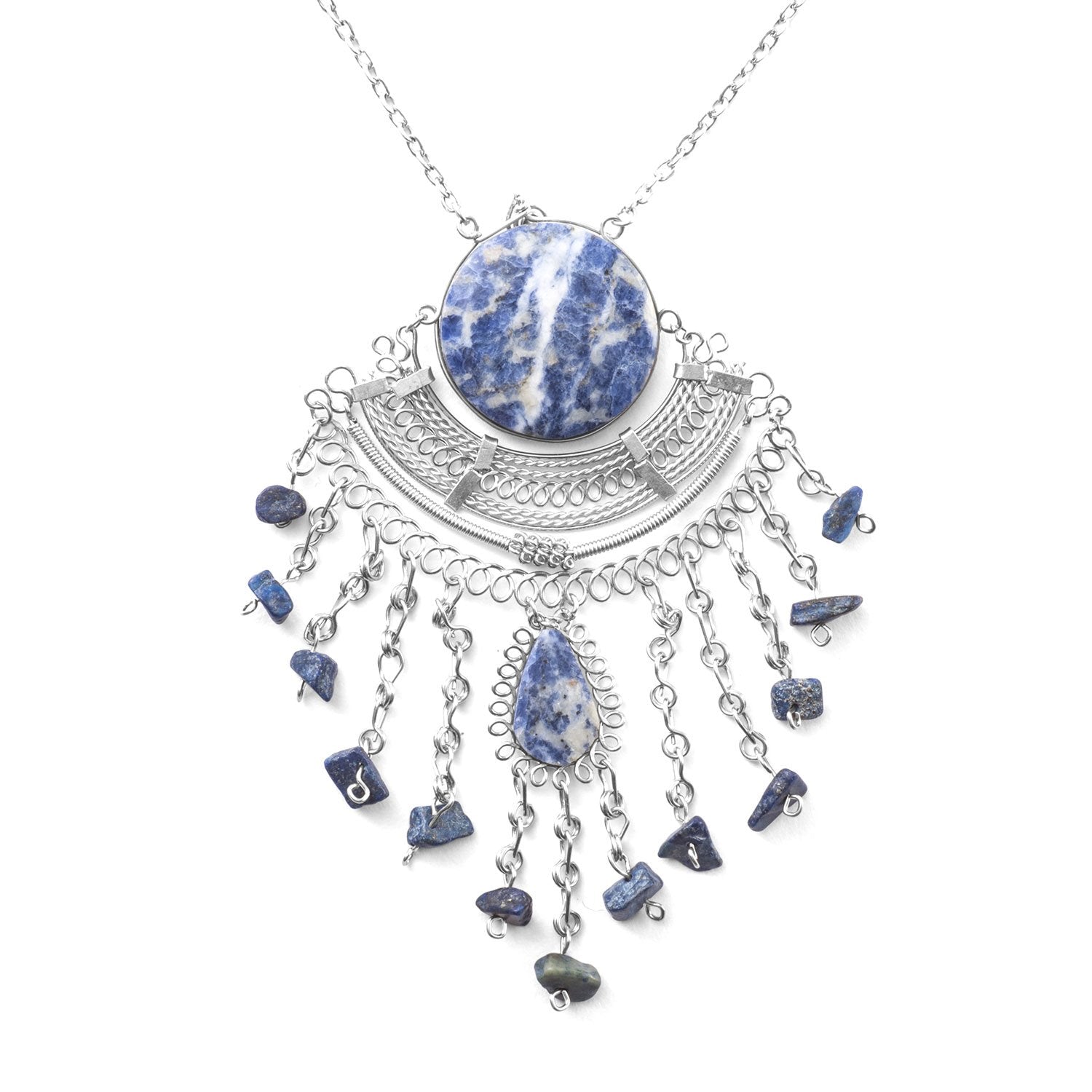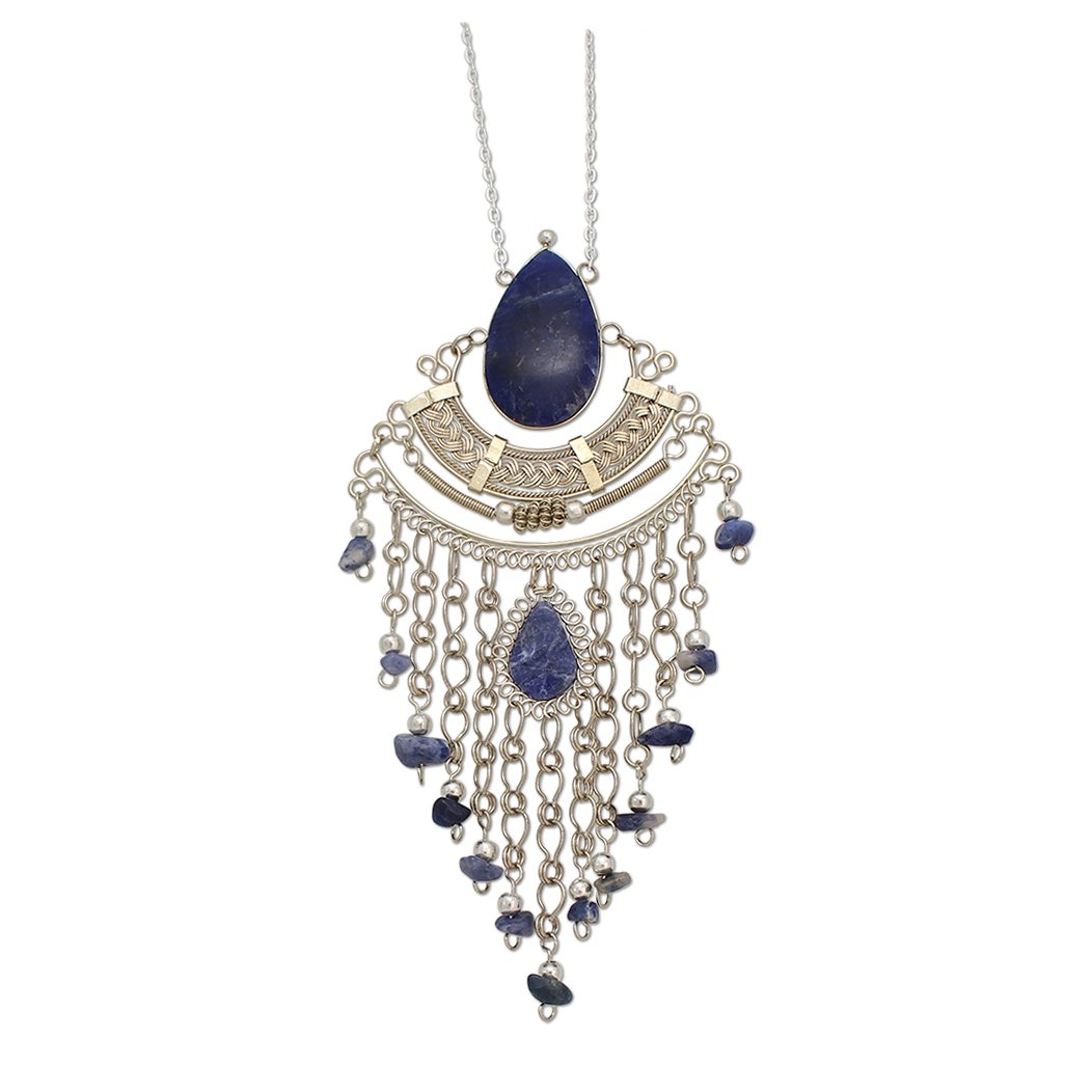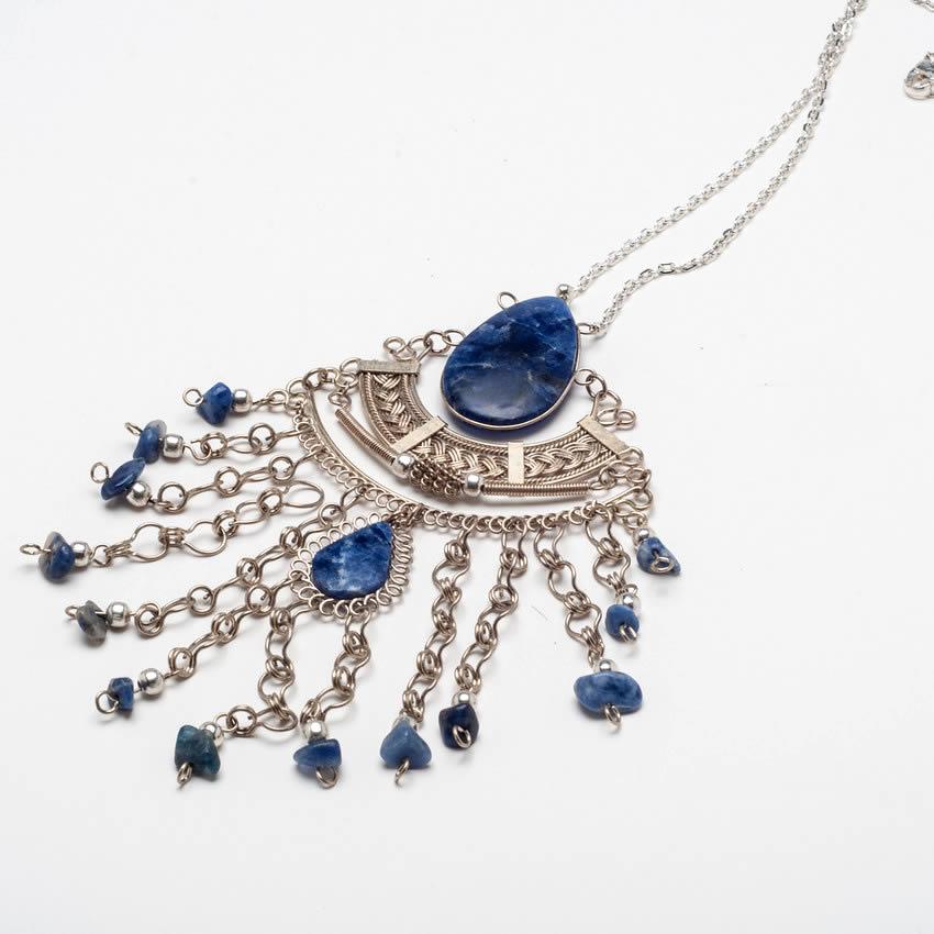 Feel like royalty wearing this intricate silver filagree-worked choker length chain with statement-making centerpiece. Braided silver design provides a regal look and large teardrop shaped stone provides a fascinating focus. Stones on both sides. Pendant hangs 5 inches. Chain is 16 inches around. Lobster claw closure. Hand worked silver from Peru.